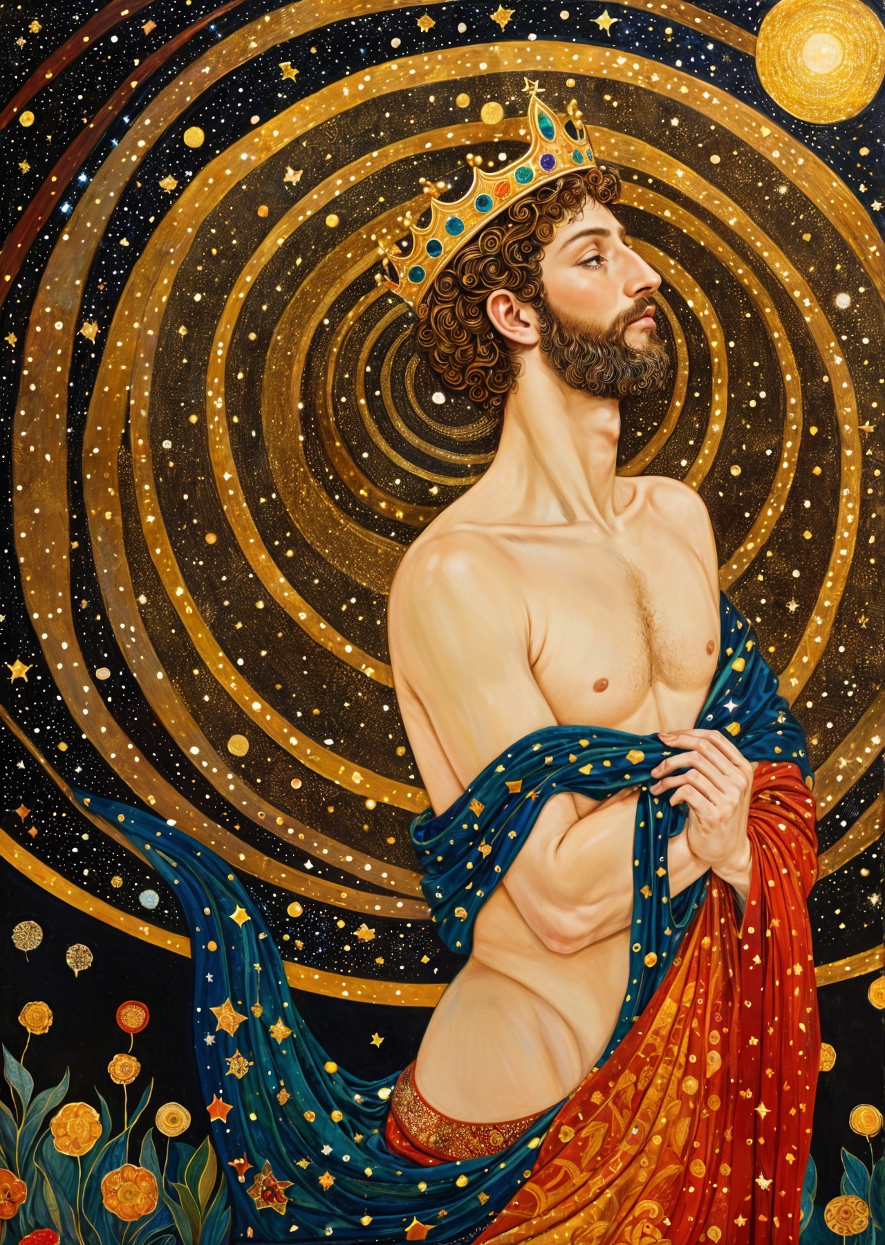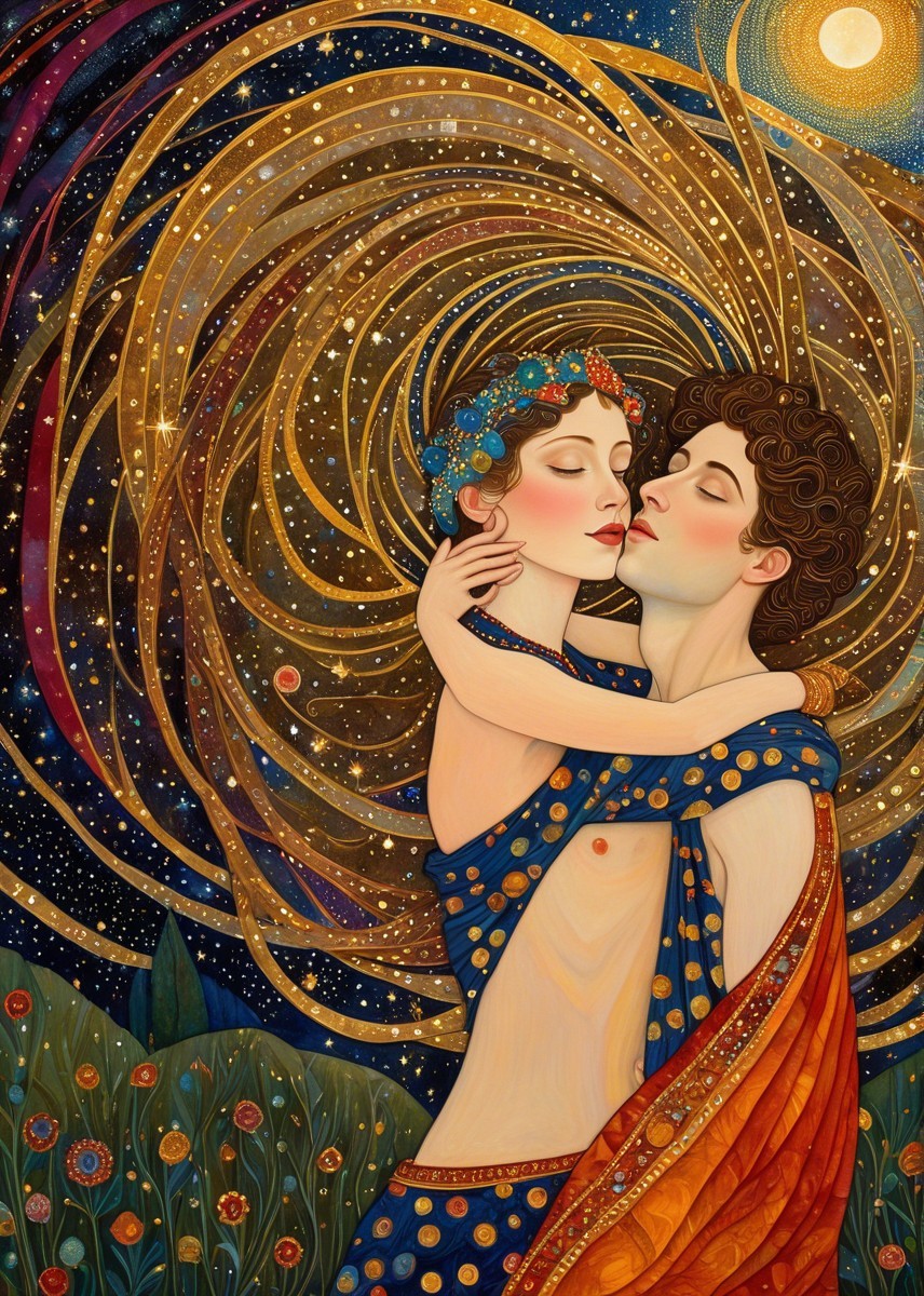 A couple embraces passionately against a vibrant, swirling backdrop of stars and mountains, adorned in colorful garments and jewelry, embodying love and cosmic energy.