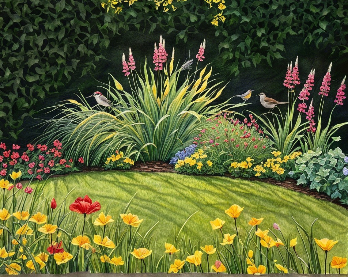 3D, Colored pencil sketch, painted on wrinkled tissue paper, colored with diluted watercolors, birds, garden with sunbeam from behind, meadow with yellow and red blossoms, tall ornamental grass, campion, behind it wrought-iron brown trellis with leaf decorations, spirals and circular branches, dark deciduous hedge, extremely detailed, sharp focus smooth detailed background, shiny, sharpen, intricate botanical details, inspired by André Bauchant