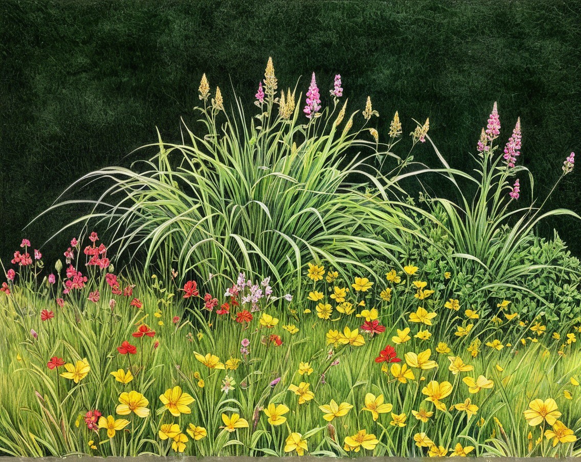 + Prompt:3D, Colored pencil sketch, painted on wrinkled tissue paper Wilderness, meadow with yellow and red flowers, tall ornamental grass, campion, behind dark deciduous hedge