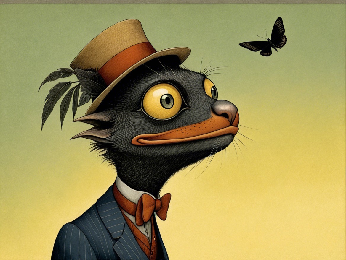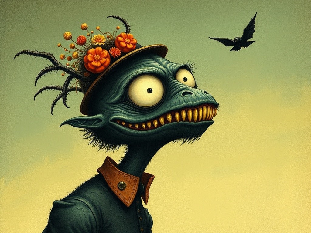 Artistic rendering of a young girl with solemn expression, tan beret, amidst stylized golden leaves on a vintage backdrop.