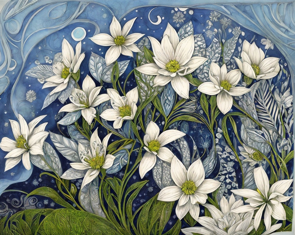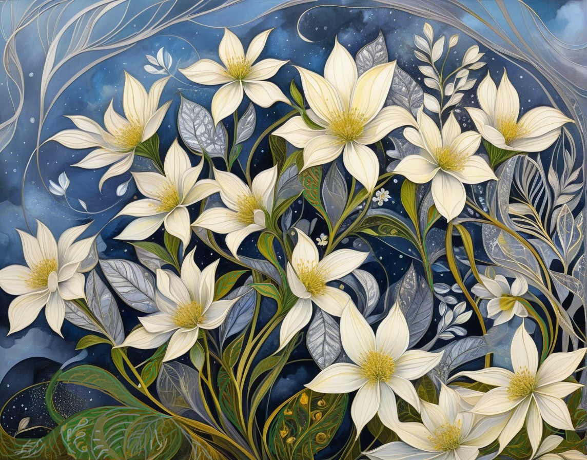 3D, colorful intricately tangled floral patterns, abstract and chaotic, delicate white-yellow blossoms entwined, against a dramatic dark sky, veil of clouds, intricate linework, fine details, high contrast, expressive strokes, mysterious atmosphere, ethereal and dreamlike