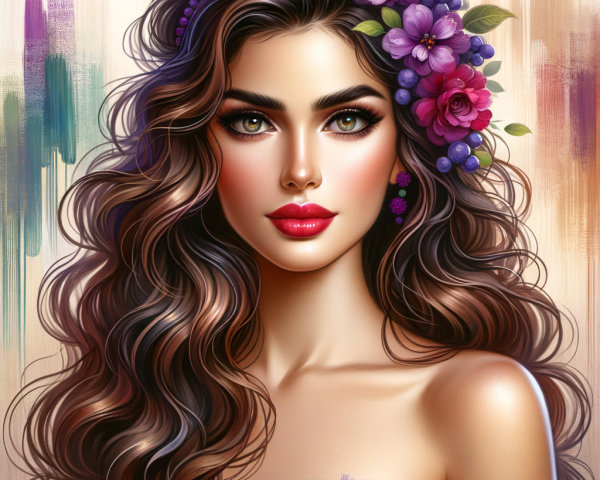A serene woman in a richly adorned blue kimono, framed by blooming flowers, poses in a tranquil landscape with mountains, a waterfall, and a traditional pagoda, evoking harmony and beauty.