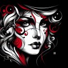 A stunning portrait of a woman with striking features, adorned with intricate red and black designs. Her vibrant hair flows gracefully, complementing her captivating eyes and bold red lips.