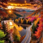 A serene autumn landscape showcases a winding road by a tranquil lake, framed by vibrant trees. Charming houses dot the shore, illuminated by a warm sunset casting reflections on the water.