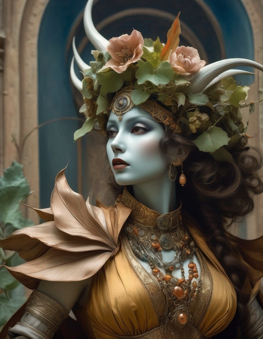 A person in elaborate fantasy makeup and costume with horns, flowers, and leaves, evoking a mythical forest creature aesthetic.