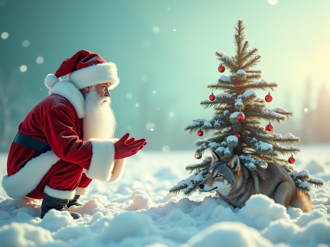 Santa Claus in a snowy forest kneels beside a decorated Christmas tree, reaching out to a curious wolf. The serene winter landscape is filled with soft snowflakes and evergreen trees.