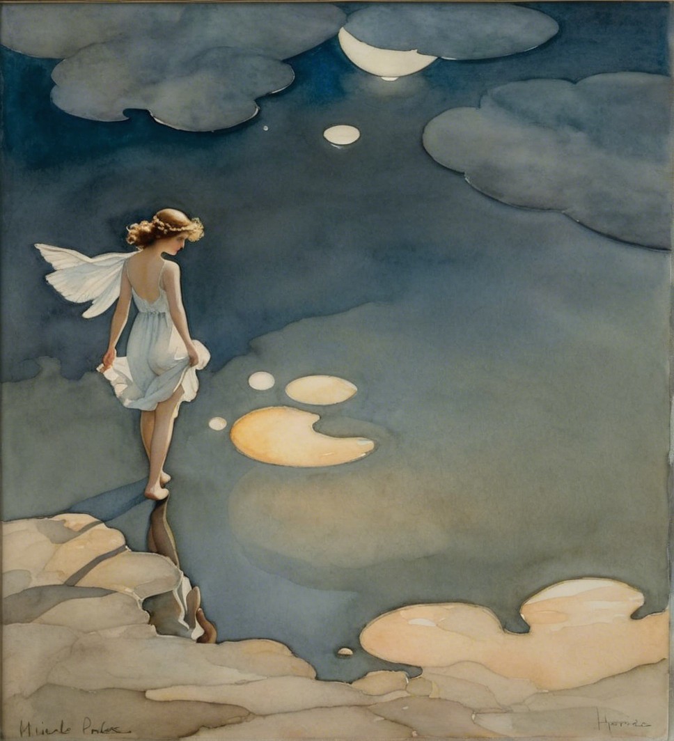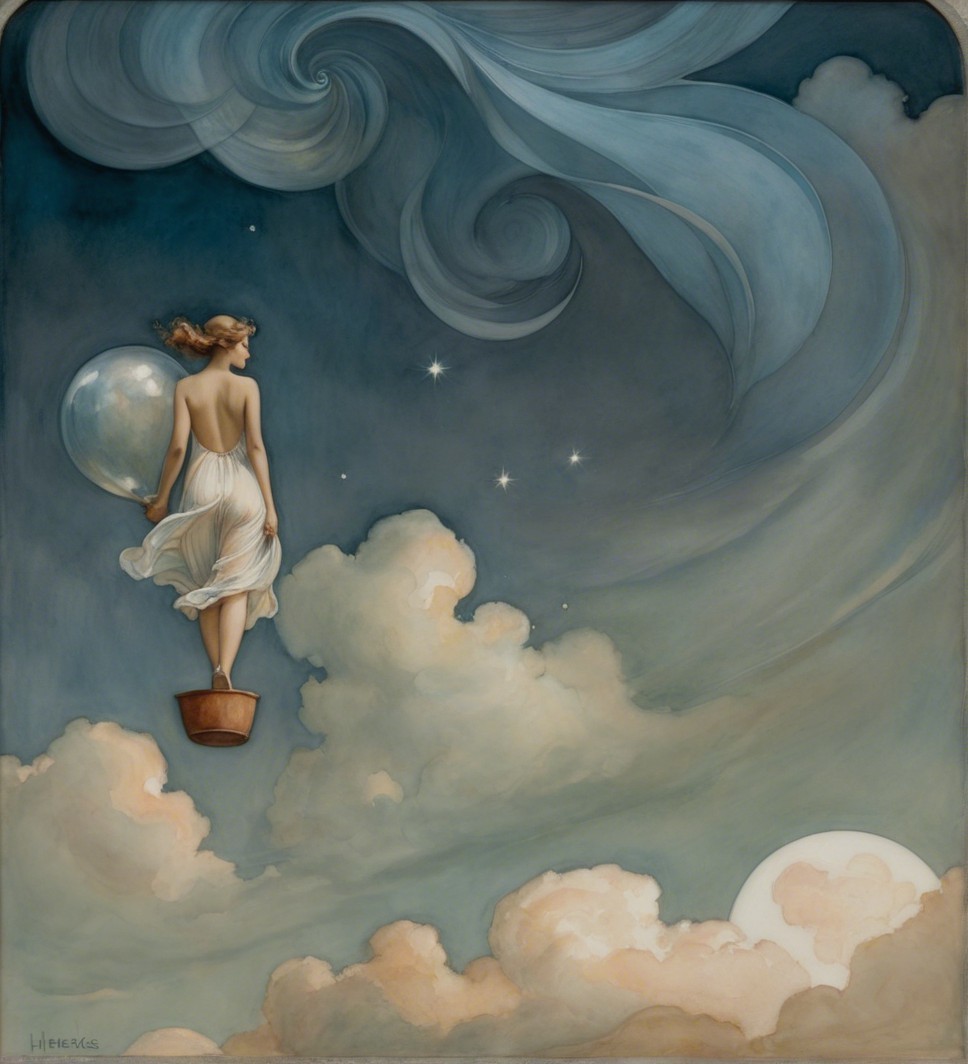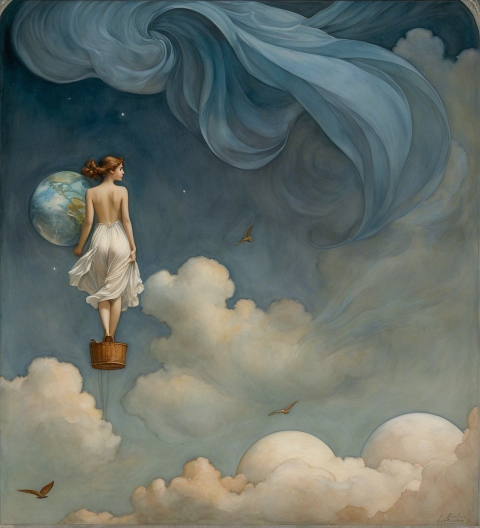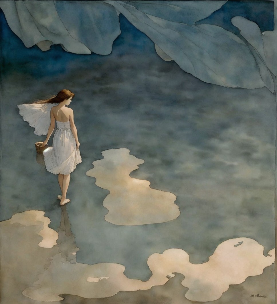 A young woman in a white dress holds a balloon while walking along a serene beach at sunset. Gentle waves lap at her feet, and a sailboat glides in the background against a painted sky.