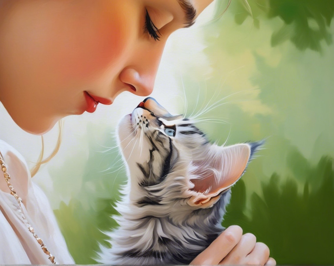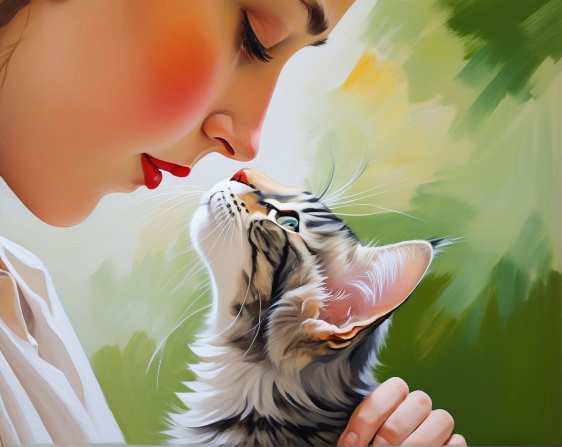 + Prompt:Girl and Maine Coon cat meet face to face and nose to nose. Create an abstract oil painting by Matisse and Egon Schiele, depicting the face of a Maine Coon Cat and the face of a young girl, facing each other, nose to nose.