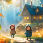Autumn Scene with Children and Cozy Cottage