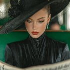 A stylish woman with striking green eyes and full lips, wearing a black pinstripe suit and a large hat. She reads a newspaper, exuding elegance and sophistication in a vintage setting.