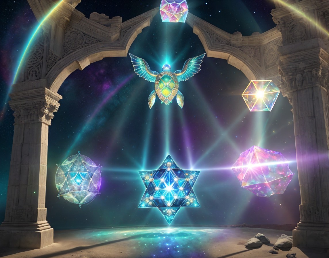 Realistic sea turtle entering a portal. Ornate extraterrestrial gateway/portal made of stone and brilliant crystals on a glowing cosmic platform covered in intricate alien glyphs and sacred geometric patterns. A flying sea turtle is exiting the portal. Illuminated by magical phosphorescent crystals and hyperprisms. Stargate with hexagonal geometric patterns. The sun, moon, and planets amidst billowing nebula clouds in a vast cosmic sky. Ultra-realistic landscape. Astral projection, alien contact, and surreal psychedelic vibes inspired by the sci-fi LSD art aesthetic. In the style of Cameron Gray