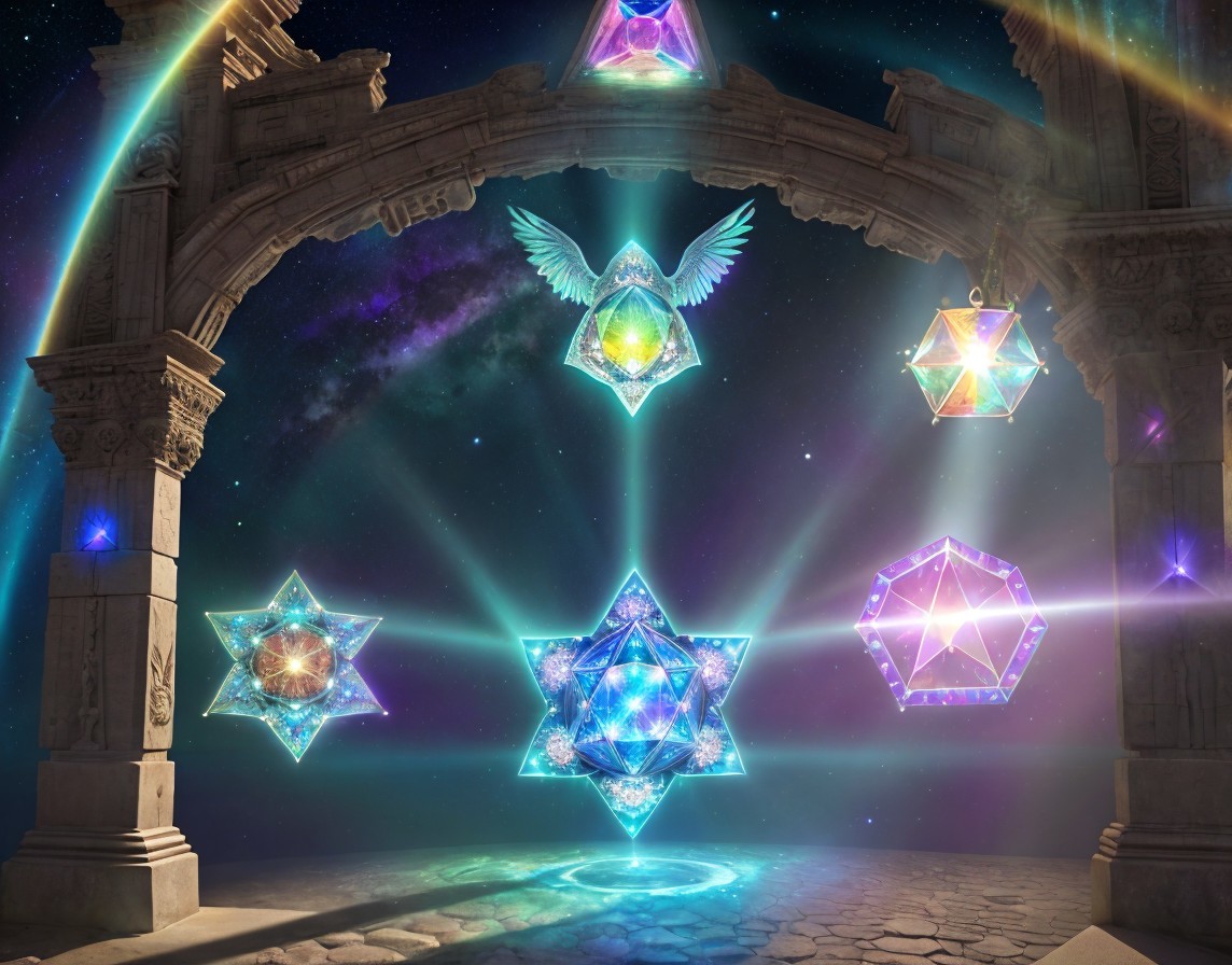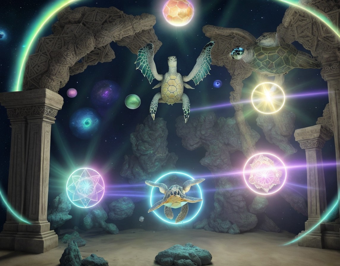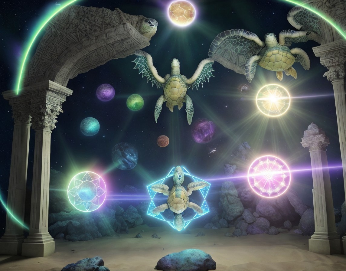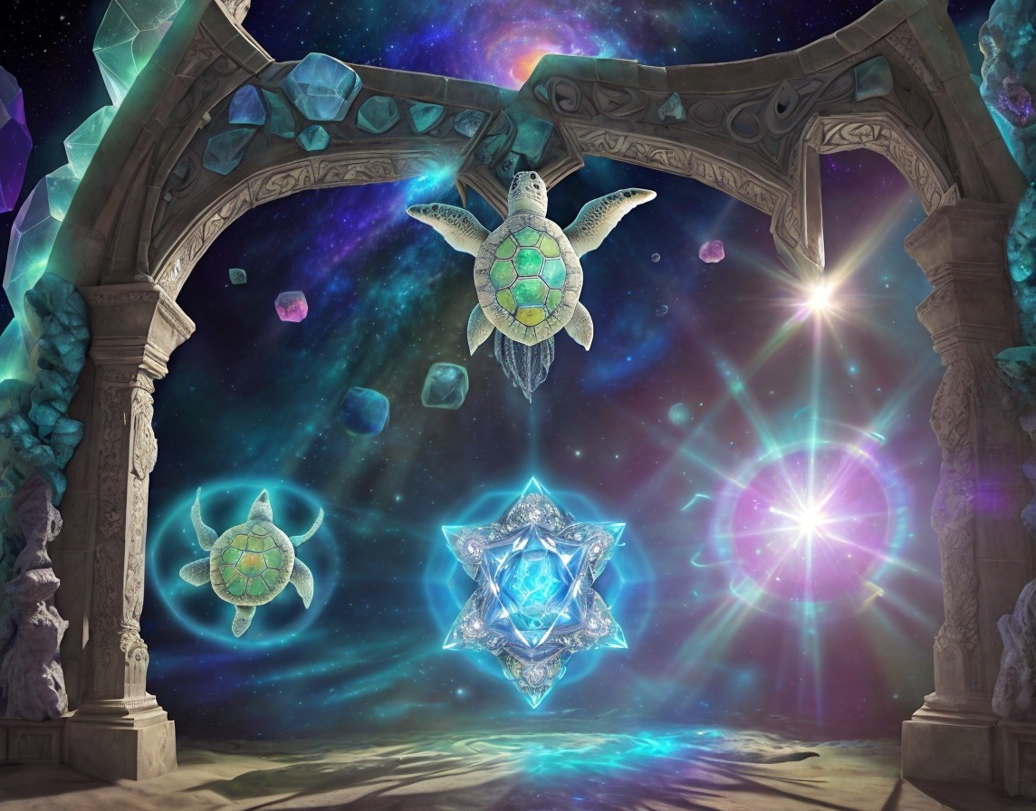 + Prompt:Realistic sea turtle entering a portal. Ornate extraterrestrial gateway/portal made of stone and brilliant crystals on a glowing cosmic platform covered in intricate alien glyphs and sacred geometric patterns. A flying sea turtle is exiting the portal. Illuminated by magical phosphorescent crystals and hyperprisms. Stargate with hexagonal geometric patterns. The sun, moon, and planets amidst billowing nebula clouds in a vast cosmic sky. Ultra-realistic landscape. Astral projection, alien contact, and surreal psychedelic vibes inspired by the sci-fi LSD art aesthetic. In the style of Cameron Gray