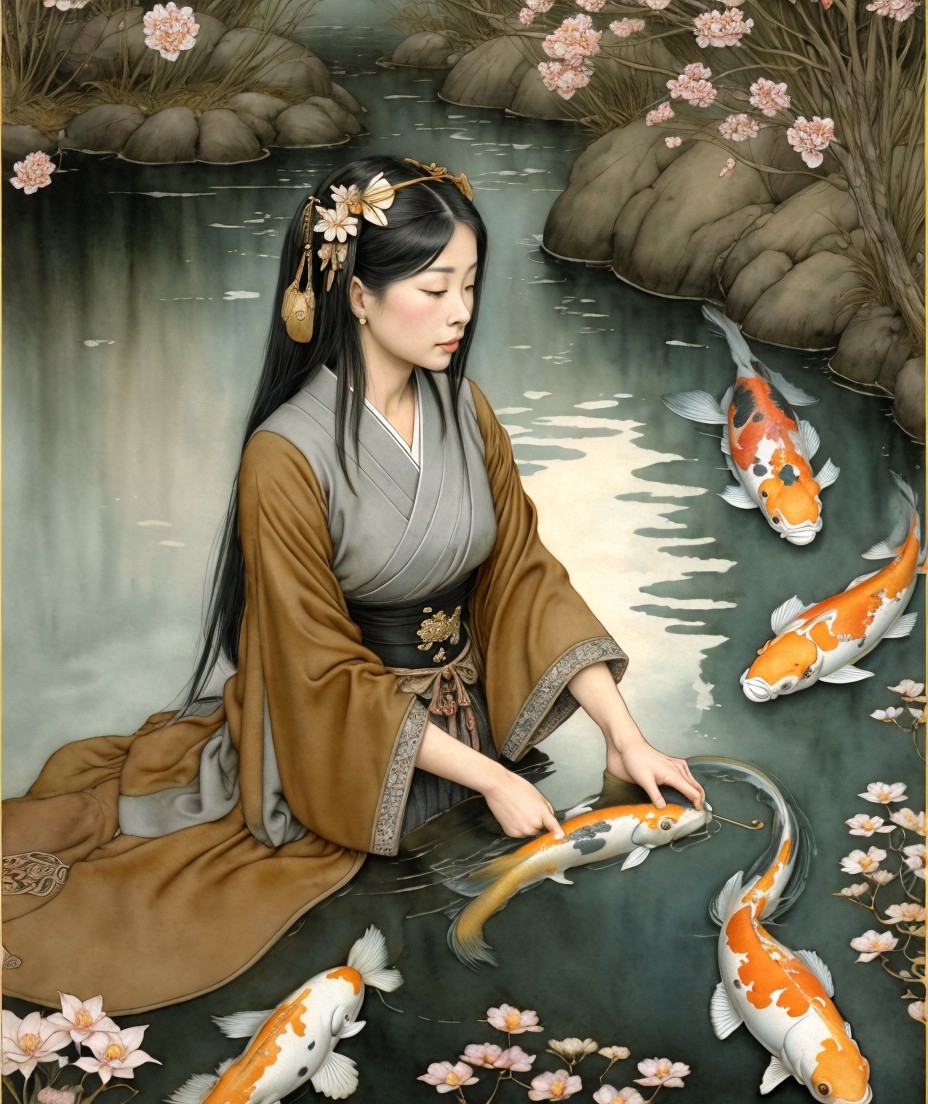The beautiful woman tending her koi. Medieval Japanese Artists Sumi-e Style, browns cream, blues and greys, Velvet Black, Shabby, Dull Gold, Amber Gray, Golden Ratio, Surreal Fantasy, Elegant, High Definition Ultra Fine 3D Line, Zenangle Style, Watercolor Patchwork , Arthur Rackham Style, Paul Kidby, , Jacek yerka, Extremely Detailed, Intricate, Thoughtful, HDR, Fractal, Beautiful, Award Winning, Fantasy Look, Fantasy, Crisp Quality