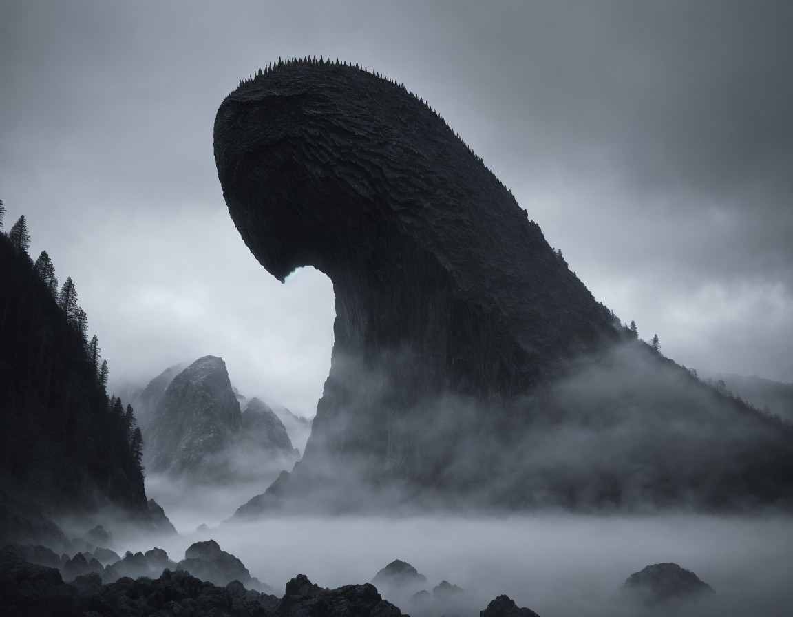 A towering, dark monolith shaped like a colossal creature rises from a misty landscape, surrounded by jagged rocks and dense fog, evoking a sense of mystery and otherworldliness.