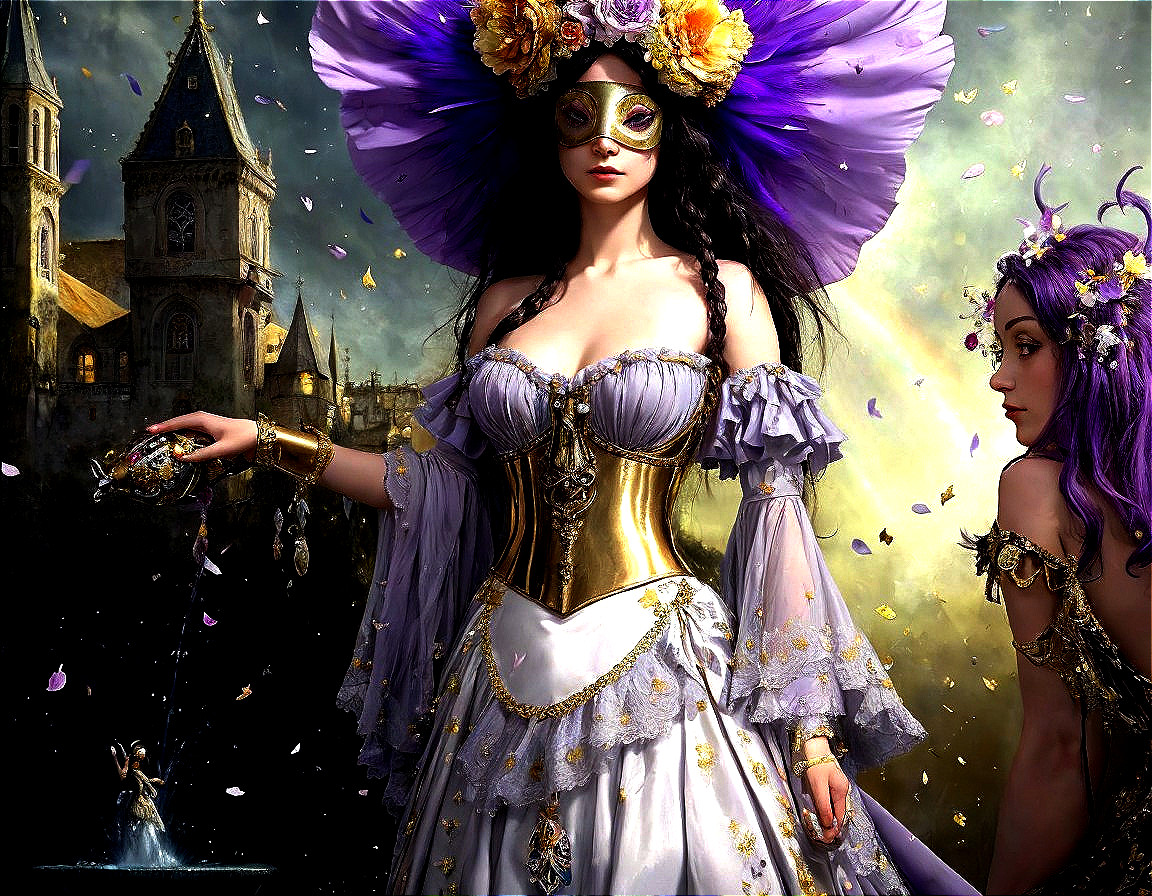 A surreal and intricate masterpiece featuring a gothic woman in Klimt-style attire, adorned with a helmet and anchor, throwing petals in a fantastical village. The artwork showcases cinematic lighting, vibrant colors, and a blend of surreal and medieval elements, akin to Alphonse Mucha's style.
