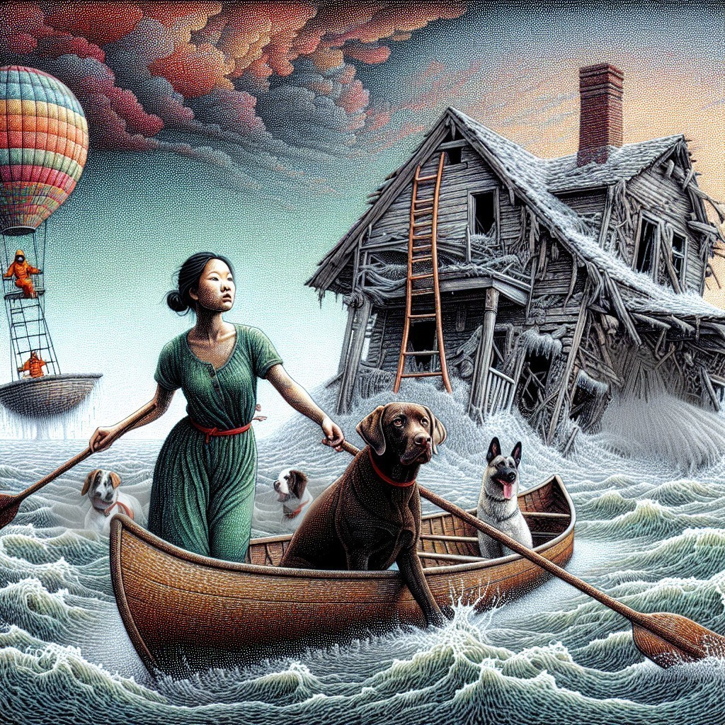 In a dramatic scene, people row a boat past a flooded house at sunset, with turbulent waters surrounding them and dark clouds above, highlighting a struggle against nature's forces.