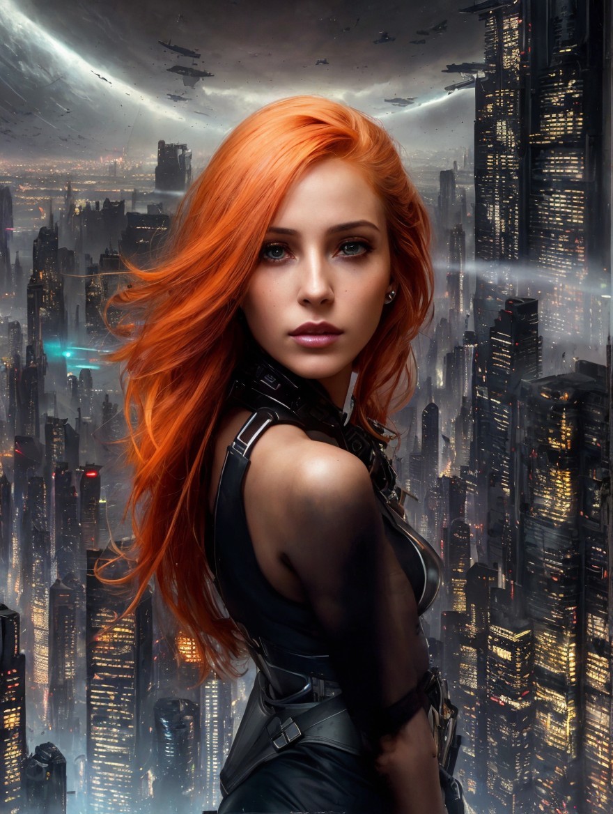 Prompt: Dark Futuristic cinematic masterpiece. Portrait of a stunningly beautiful woman in a decaying futuristic city. Fantastic art award winner 8k , oil on canvas, cinematic lighting, poster, fantastic view, high definition, hdr, cinematic postprocessing, focused, Oil on panel,