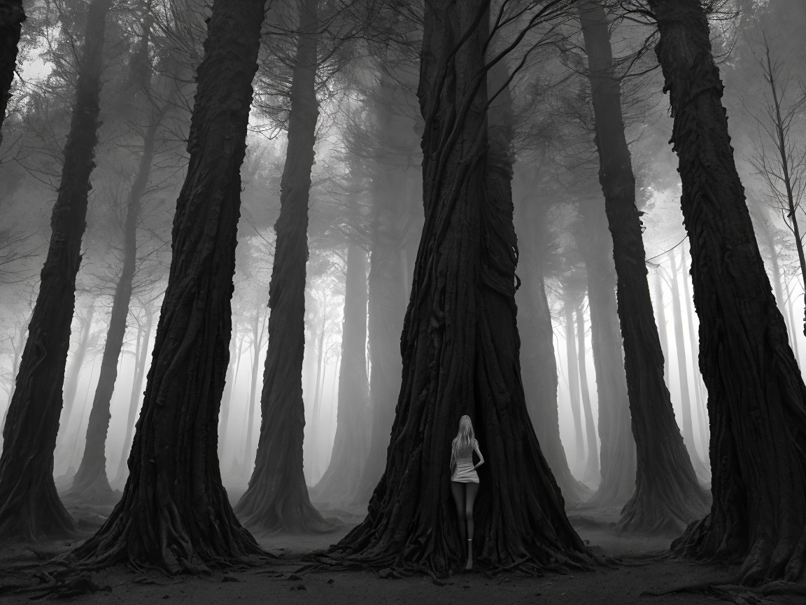 A slender figure in a flowing black dress stands amidst tall, dark trees in a misty forest. The monochrome scene evokes a sense of mystery and ethereal beauty.