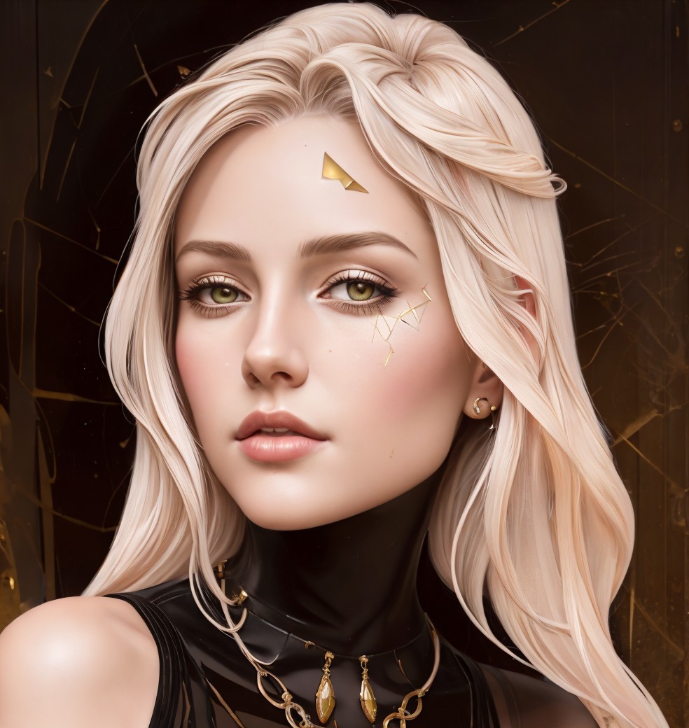 + Prompt:Art Nouveau portrait, masterpiece in the style of Overton Loyd. Picture a stunning representation of a female head, crafted with golden and tinc elements, embossed with intricate details such as cracks, crackle, contraptions, and glass fragments. Embrace various art techniques like graffiti, 3d art, street art, graffiti, oil and gouache melting, brushed texture. esoteric elegance and magical realism, volumetric lighting, anisotropic filtering 1.7, shadow mapping 1.3, dynamic lighting 1.7, colorful reflections, vibrant strokes, maximalism, radiance, highly detailed ornamental features, fantasy style, illustrative maximalism, plasticity 1.6, complexion, tilt shift,8k, octane render,