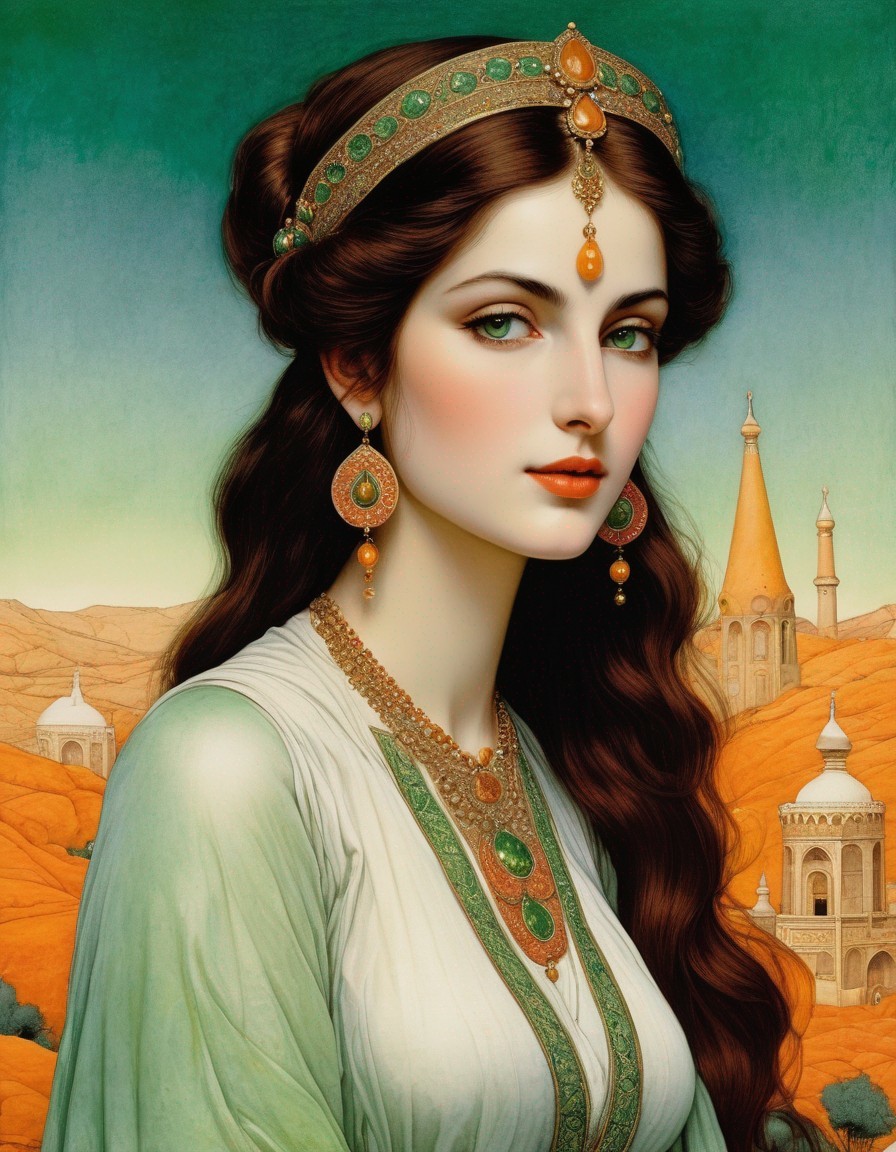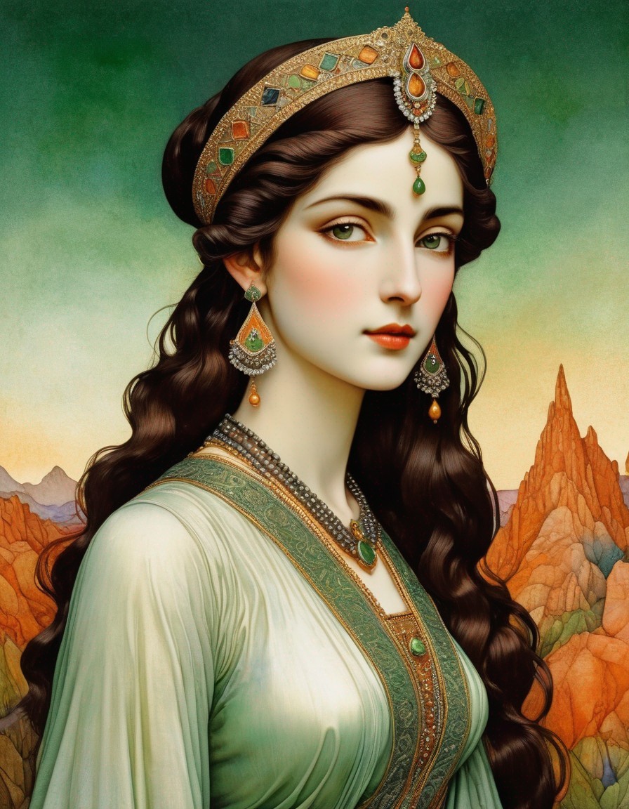 Iris, goddess of the rainbow. 3rd century Persian miniature art, absinthe green, copper, apricot, eggshell, plum, silver, sage green, paprika, Velvet Black, Shabby, Dull Gold, Amber Gray, Golden Ratio, Surreal Fantasy, Elegant, High Definition Ultra Fine 3D Line, Zenangle Style, Watercolor Patchwork , Arthur Rackham Style, Paul Kidby, , Jacek yerka, Extremely Detailed, Intricate, Thoughtful, HDR, Fractal, Beautiful, Award Winning, Fantasy Look, Fantasy, Crisp Quality Modifiers: Kamal al-Din BihzadEgon Schiele, dynamic poses, silk iridescent texture in watercolor and ink, shades of black, greys with gold foil detail,colored ink drawing, watercolor artwork on old withered paper, vintage, by Caravaggio, Fragonard, Anton Pieck, pale colors, high detail, intricately detailed, hyperdetailed volumetric lighting, art nouveau graphic steampunk., whimsical, beautiful, poignant, touching. colors rose, gold, rust, burgundy, black.soft watercolor extra water in Art Deco by Annigoni, Egon Schiele, Milo Manara, Botticelli, Catrin Welz-Stein, Jean Metzinger, Klimt, perfect eyes, perfect handsface, highly detailed, complementary colors, hyper detailed