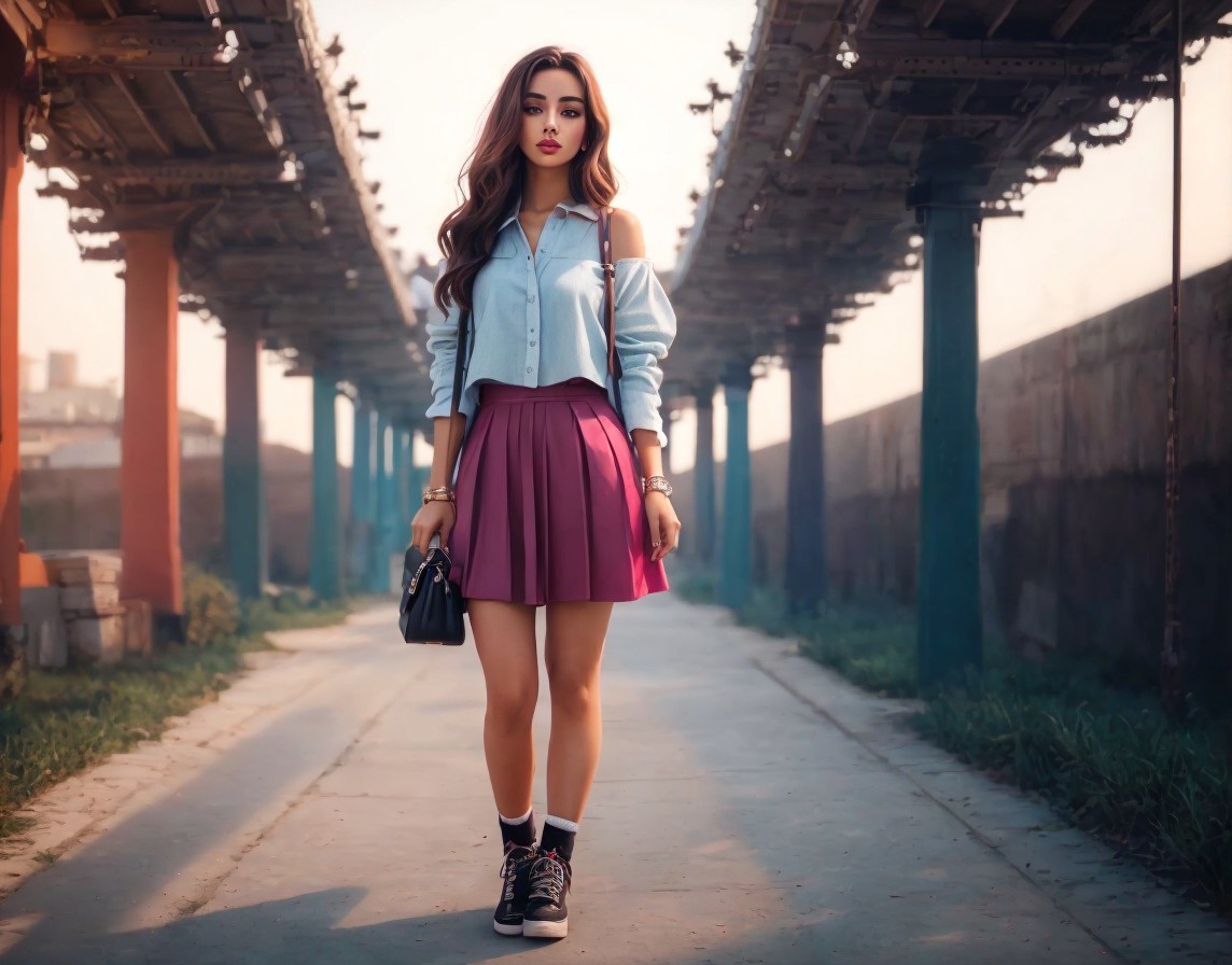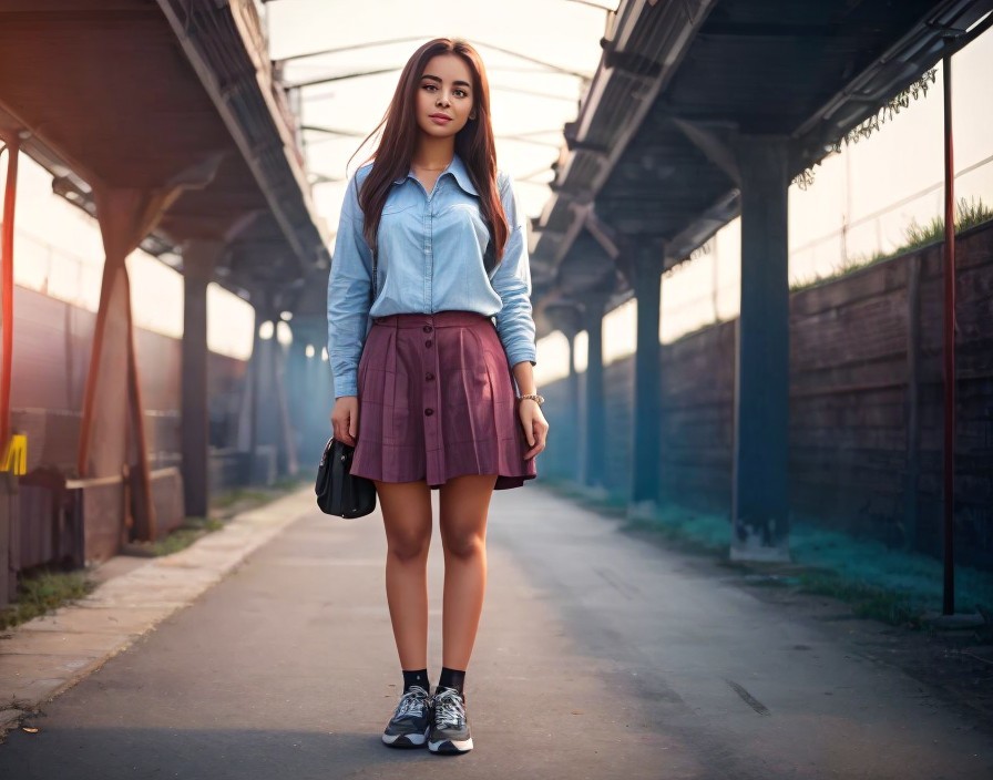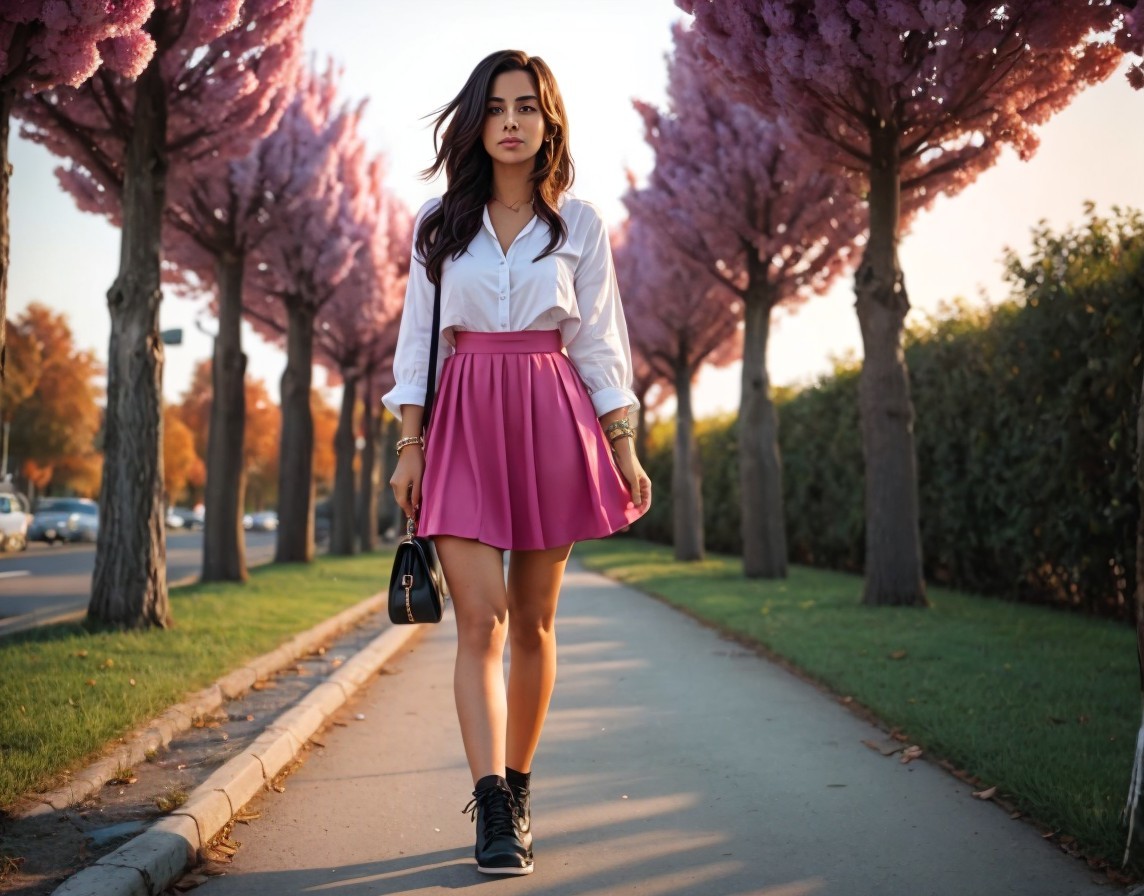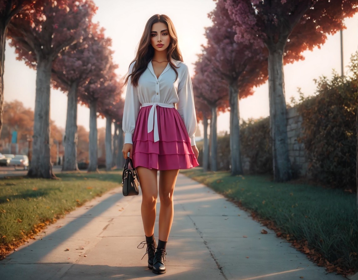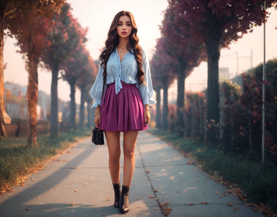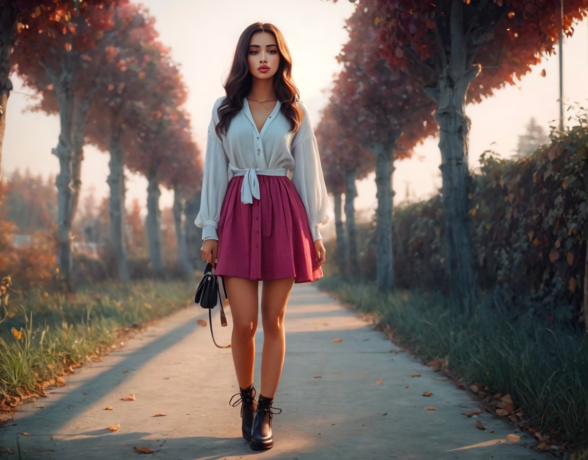 Young woman in stylish outfit on tree-lined path