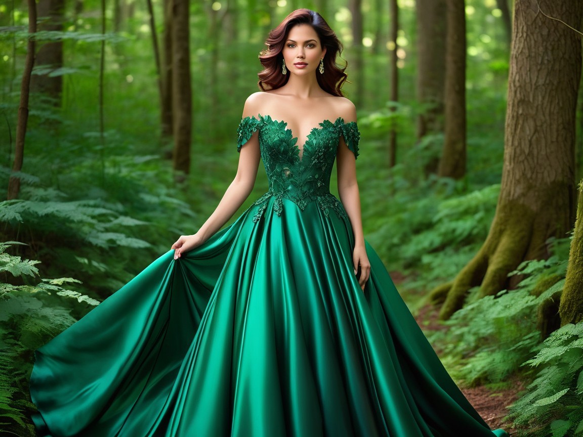 A woman in an elegant green gown stands gracefully in a sunlit forest, her outfit adorned with a sparkling bodice. Soft fabric flows around her, enhancing the enchanting atmosphere.