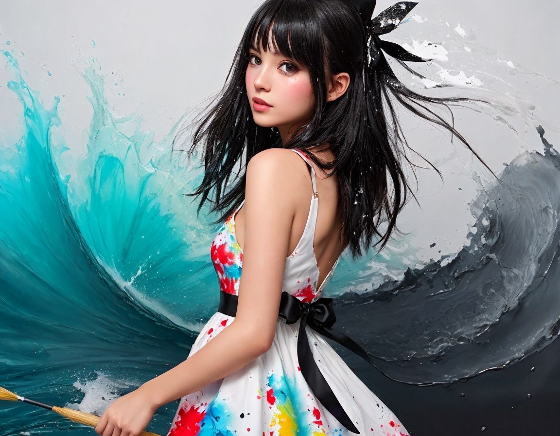 Prompt: little girl splashing in the wake of a paint wave, cute dress, black hair with ribbon, heavy painting, large brush strokes and paint splatter, highly detailed and intricate, beautiful colors, beautiful, very cute