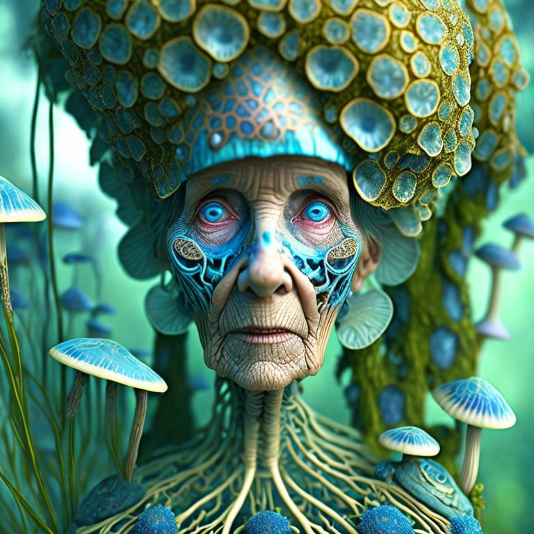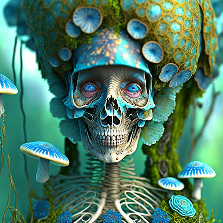 Skull surrounded by blue mushrooms and moss in mystical forest scene