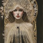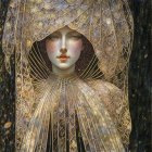 A woman with flowing red hair wears a delicate lace veil and a soft green dress. She stands against a backdrop of stained glass and autumn leaves, evoking an enchanting, ethereal atmosphere.