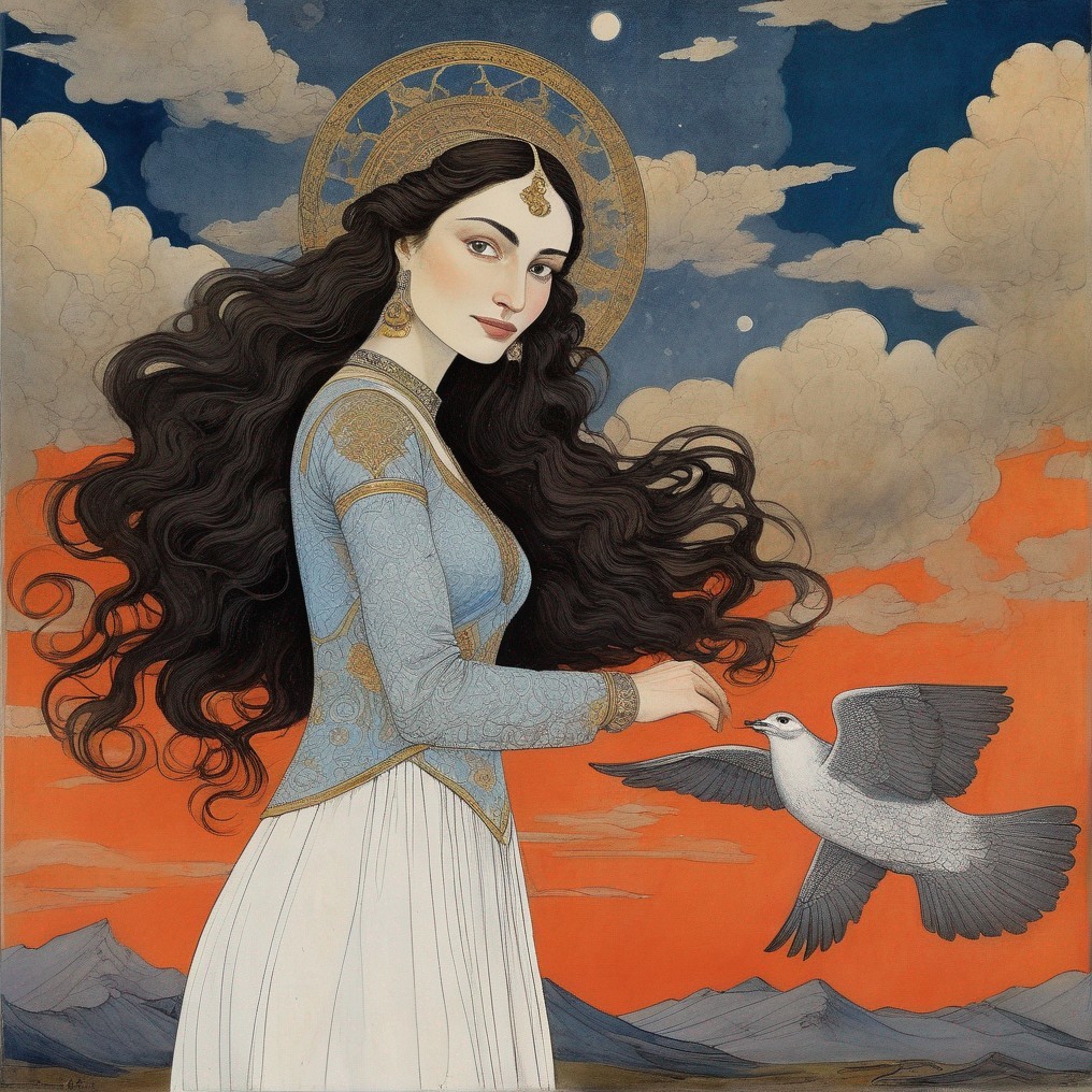 Beautiful goddess. 3rd century Persian miniature art Mysterious, ethereal, alluring . Enigmatic smile. Beautiful clouds at dawn. , andrew wyeth, edward gorey, hope gangloff, spare style, liminal