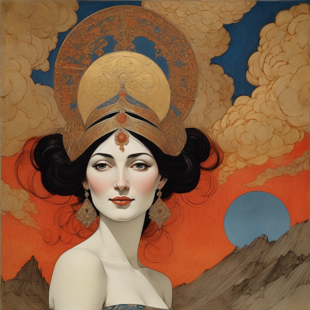 + Prompt:Beautiful goddess. 3rd century Persian miniature art Mysterious, ethereal, alluring . Enigmatic smile. Beautiful clouds at dawn. , andrew wyeth, edward gorey, hope gangloff, spare style, liminal