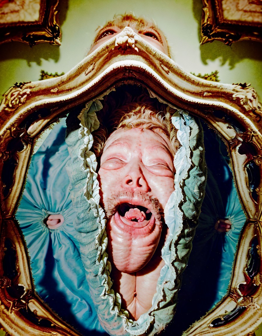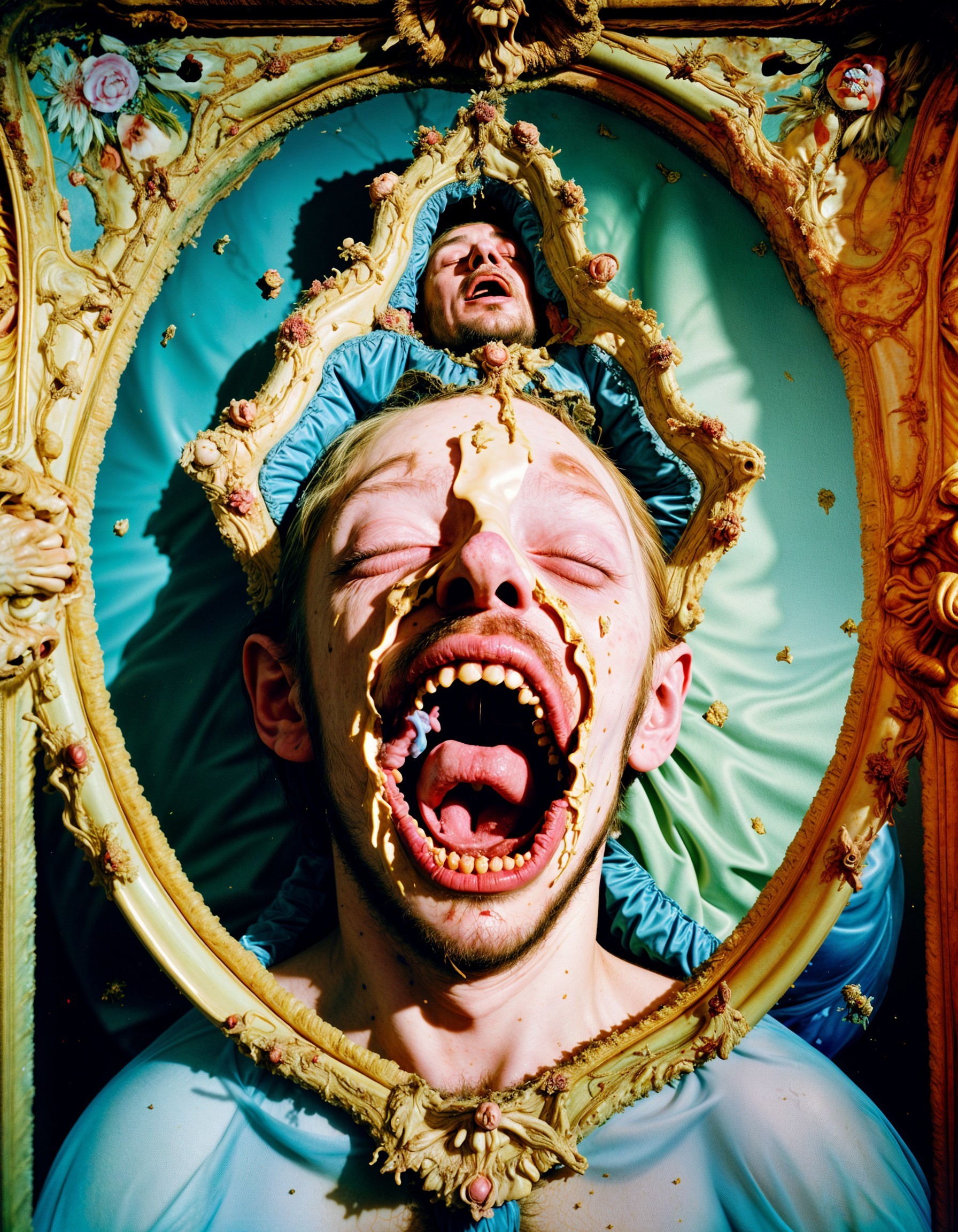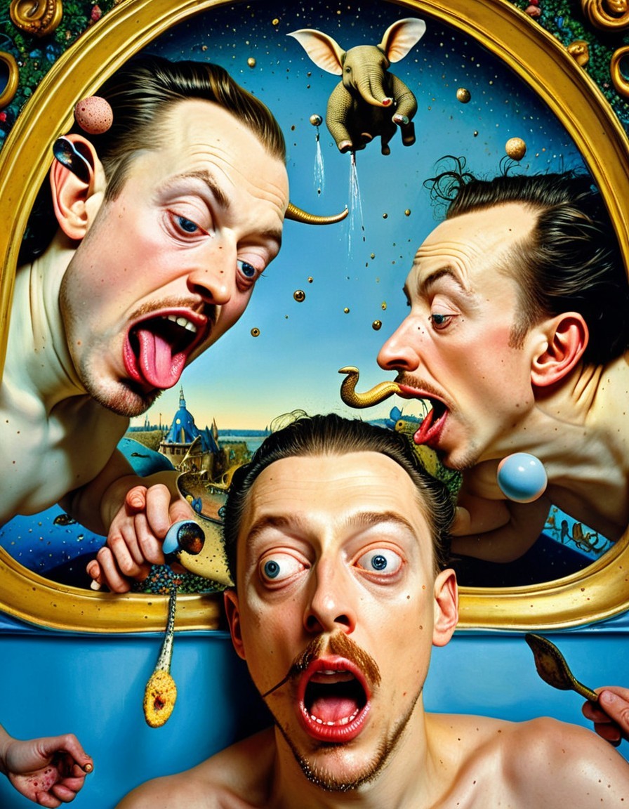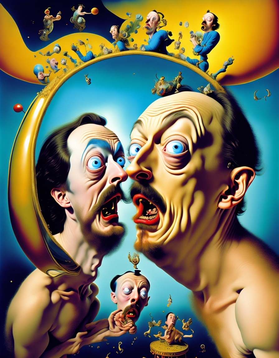 The image features a surreal scene with exaggerated facial expressions and bizarre characters surrounding a central figure, creating a dreamlike, absurd atmosphere. Vivid colors enhance the distortiodr4xyull, 1