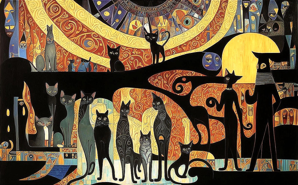 Prompt: surrealism. a gathering of silhouetted priest of the cast. Bastet mythology. Priestess of the feline God. Cats. Old wizard eye of the cat. old. very very old. rustic, inside the mirror, Cat face. a amalgam between inkwork by Picasso and elaborate weirdness by Gustav Klimt. Also: Cats.