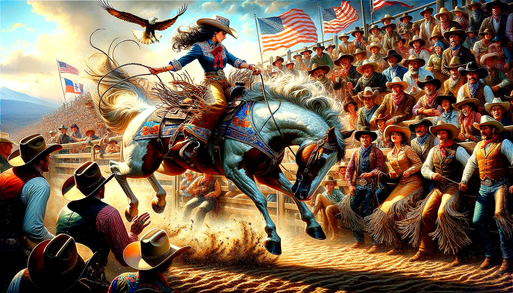 A stunning digital painting captures an American cowgirl riding a wild bucking horse at a rodeo, with cheering spectators in a typical Wild West scene. The artwork is detailed, photorealistic, and attractive, featuring imperial colors and hyperrealistic elements. This award-winning masterpiece in high definition is rich in detail, vibrant in color, and anatomically