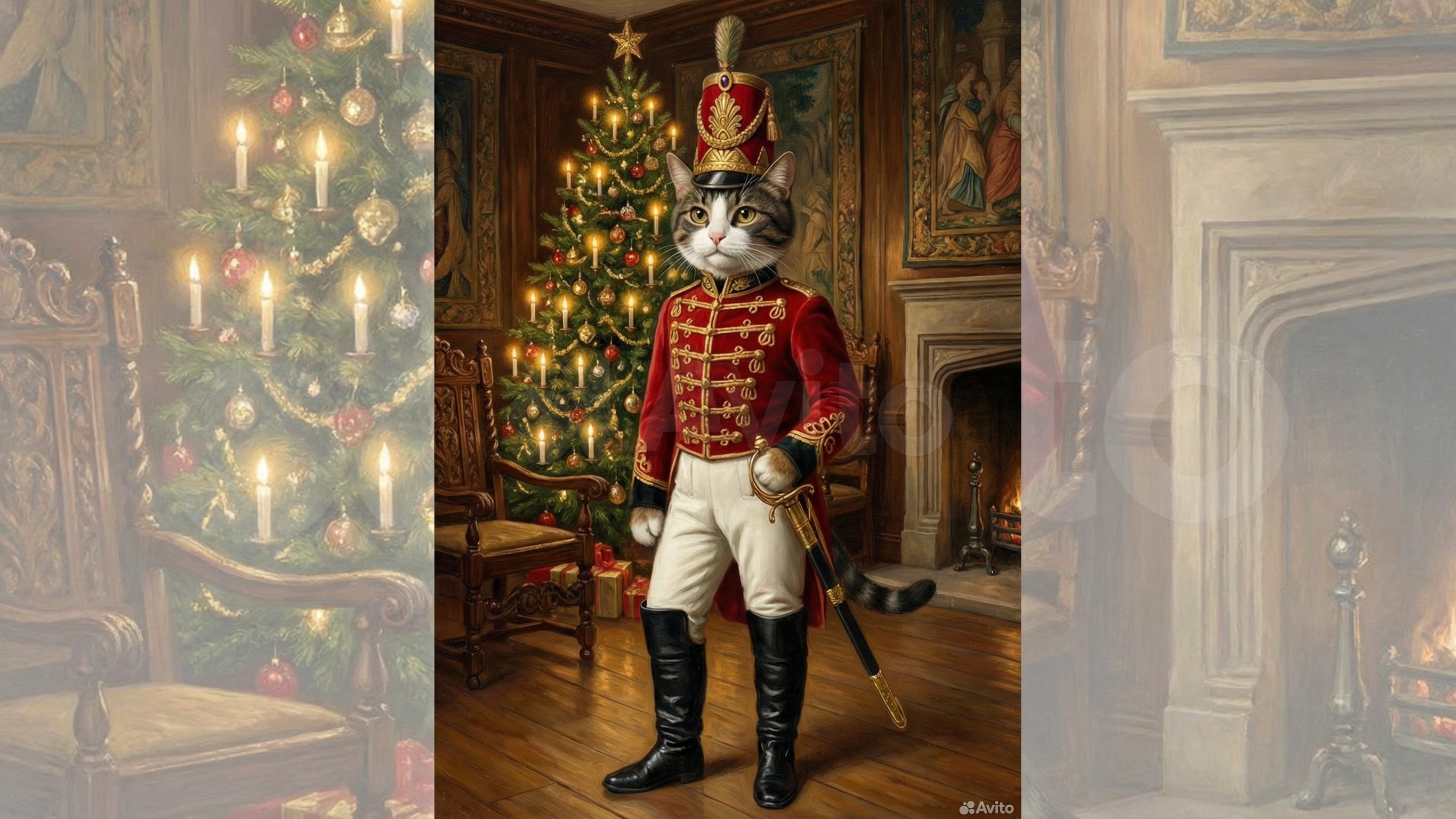 A highly detailed, whimsical painting of a tabby cat dressed as a Nutcracker soldier in a festive Christmas setting. The cat wears a tall red and gold military shako with a black brim and a white plume, a vibrant red military jacket with elaborate gold braiding and black cuffs, white trousers, and tall