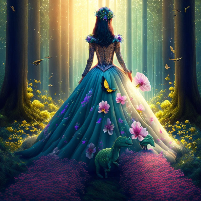 Prompt: "princess standing on a flower field in a dark forest, surrounded by high and dark trees, on the nightsky there are dinosaurs and in the middle the face of a beautiful and friendly queen full of light"