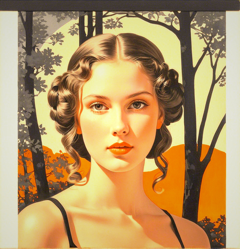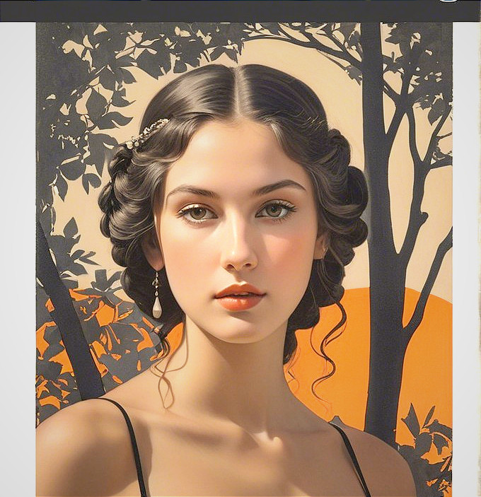 Prompt: Gouache portrait, anthotype print, stylized portrait of a young temptress with pale skin tone and striking almond-shaped light black eyes. Her long glossy hair is styled in a relaxed updo with few curly streaks framing her face, simplifued bohemian or nature-inspired style. Novelty architecture, precise Gelsculpt, pastel tones of orange and pale grey,, Byzantyne face type, panavision, xeroxed with Ilford Sprite 35-ii Reusable camera, Reflecting, Stylized Portraiture, Stylized woodblock print with stacked-up perspective, contouring outlines by Susan Seddon Boulet, embodying by Didier Lourenço, juvenile, Beautiful, gothical, aquarelle, wet on wet, maximised watercolor effects, cottagegore, stylized pop art by ho baron merged with pulp art, blotting, stacked-up perspective, hues by Susan Seddon Boulet and david graeme Baker, boho style merged with foampunk, lineage derails in thin strokes, rounded edges, juvenile woman with tessellated hair, forestal background with pointillism details: simplistic trees, reminiscent of autumn academia, delicate shades of Auburn and pale green, divisionism, sculpted, soft diffused light, mystical, parallax occlusion 1.5, luminous, enhanced Casual line and wash sketch, nuanced, serene, foampunk, uhd,hdr, octane render illustration 1.5, simplified comic book art 1.7, stippled, coherent, stacked-up perspective, charcoal textures 1.7, geaceful heroine in style of Overton Loyd and ed binkley, overexposed dark sky, plasticity 1.6, luminosity 1.3, Doodle Naive details, xeroxed, stylized filigree style, tiny brushstroke fields, brightness 1.9, reminiscent of watercolor & ink, tesselated, muted green and ochre hues, dethereal and mesmerizing in the style of Overton Loyd, hues by david graeme Baker, abstract cubistic features, comic book art by Peter ellenshaw, american gothic 1.7, tetradic color scheme green red lilac auburn, hues, close-up, Handsome curly hairdo, quilling, warm coloring 1.9, rounded edges, rim dynamic lighting,