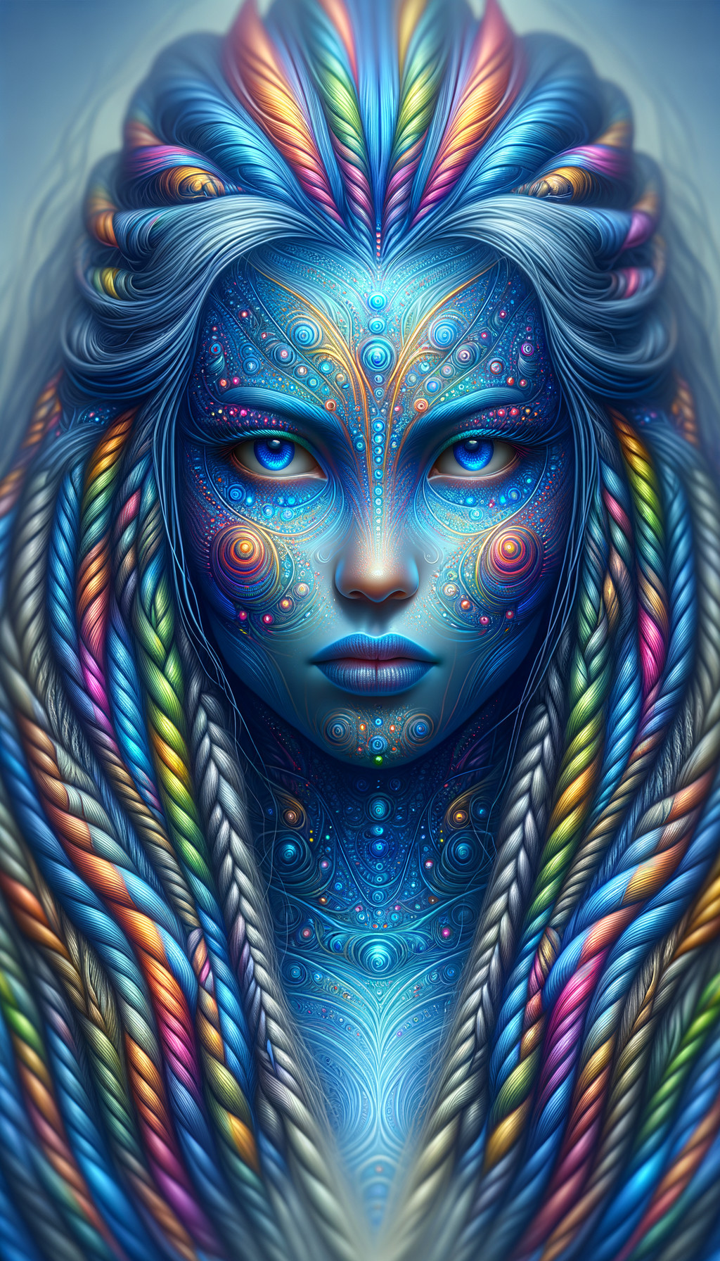 Blue-skinned fantasy character with intricate golden and white facial markings and braided hair with gold accessories.