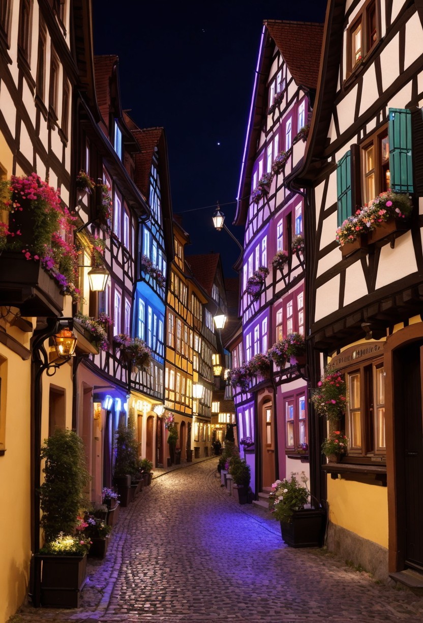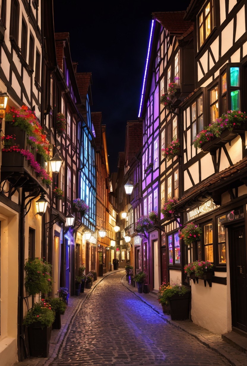 + Prompt:A dazzling nighttime scene of an old German town, where the past and the future collide. The narrow cobblestone streets are lined with half-timbered houses in various colors and shapes, but they also feature holographic displays, neon lights, and small floaty robots that buzz around. Some of the houses have flower boxes on their windows, while others have signs indicating their trade or profession, such as clockmaker, inventor, or alchemist. A Gothic church tower rises above the rooftops, but it is adorned with metal pipes, gears, and steam vents. The town is surrounded by green hills and forests, but they are dotted with airships, factories, and railways. The town is a vibrant part of the city, with lots of life and commotion, where people, machines, and magic coexist.