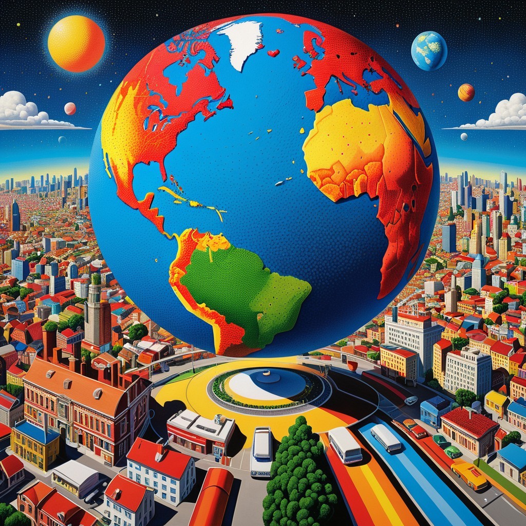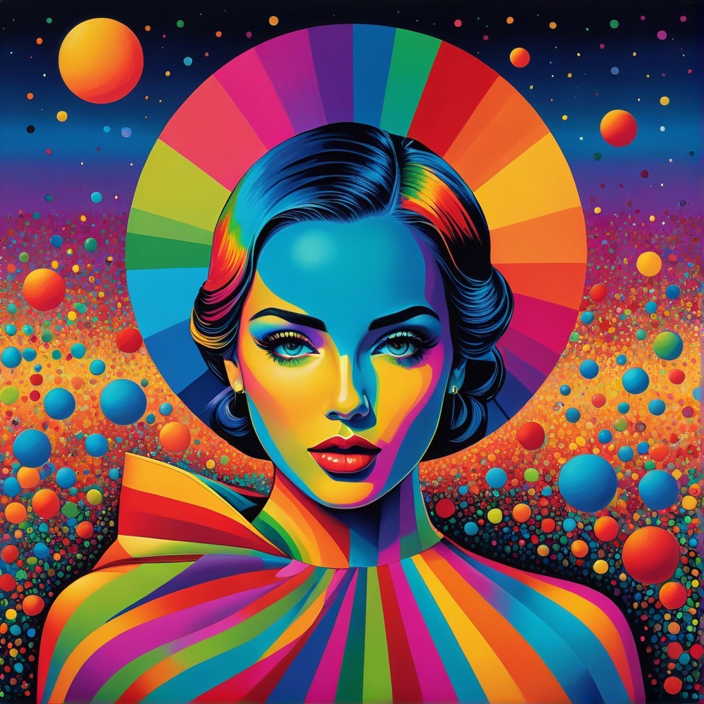 A vibrant, colorful pop art portrait of a woman with a striking background of geometric shapes and a city skyline, radiating energy and creativity.