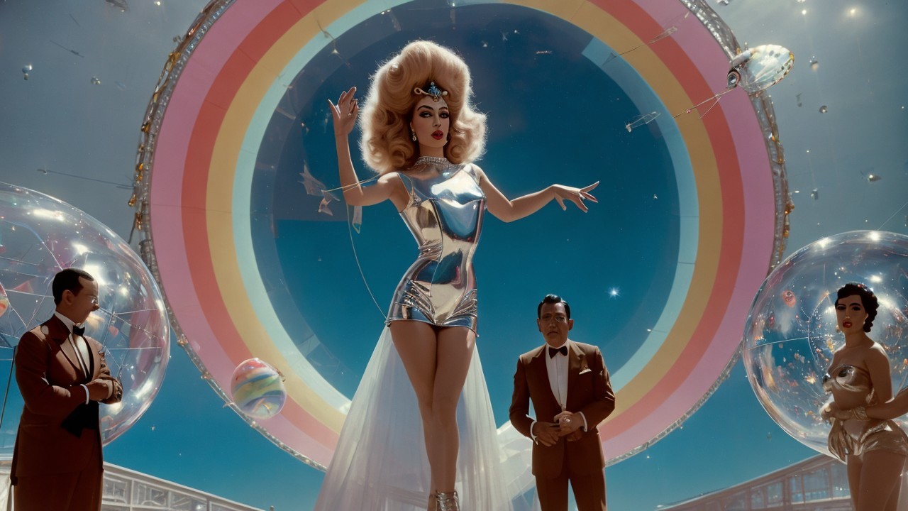 (Try from seabird) - A glamorous scene featuring a dramatic figure in a shiny silver outfit, surrounded by vibrant rainbows and sparkling spheres, flanked by elegantly dressed companions in rich colors.