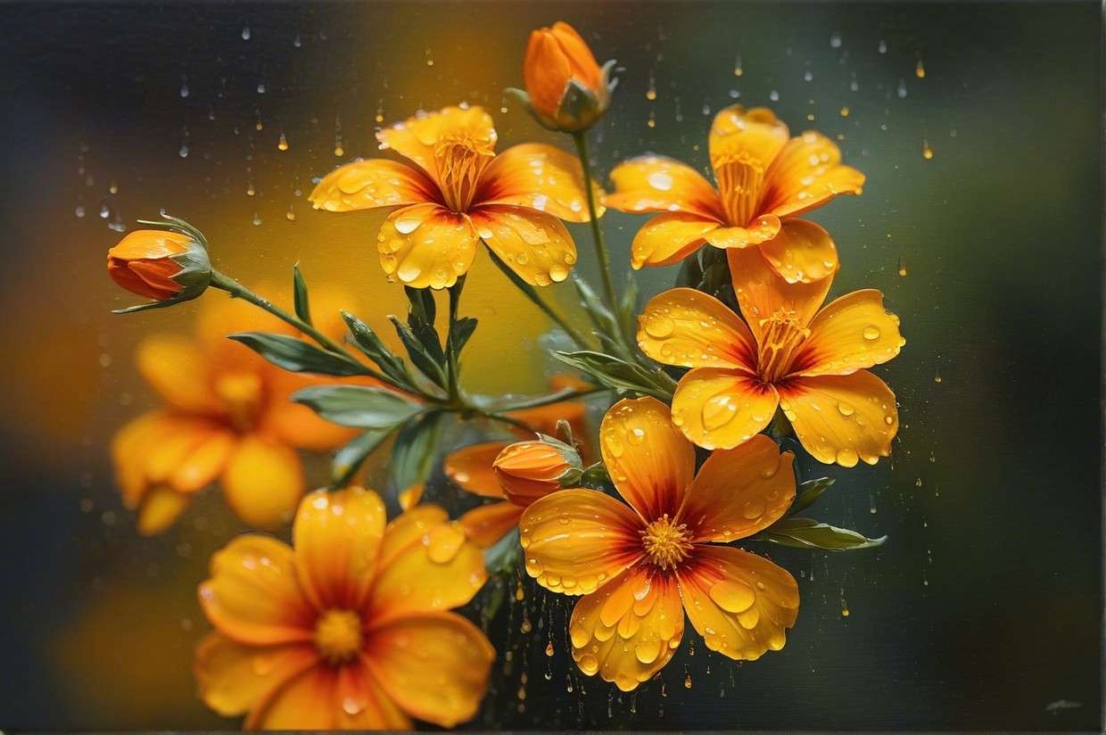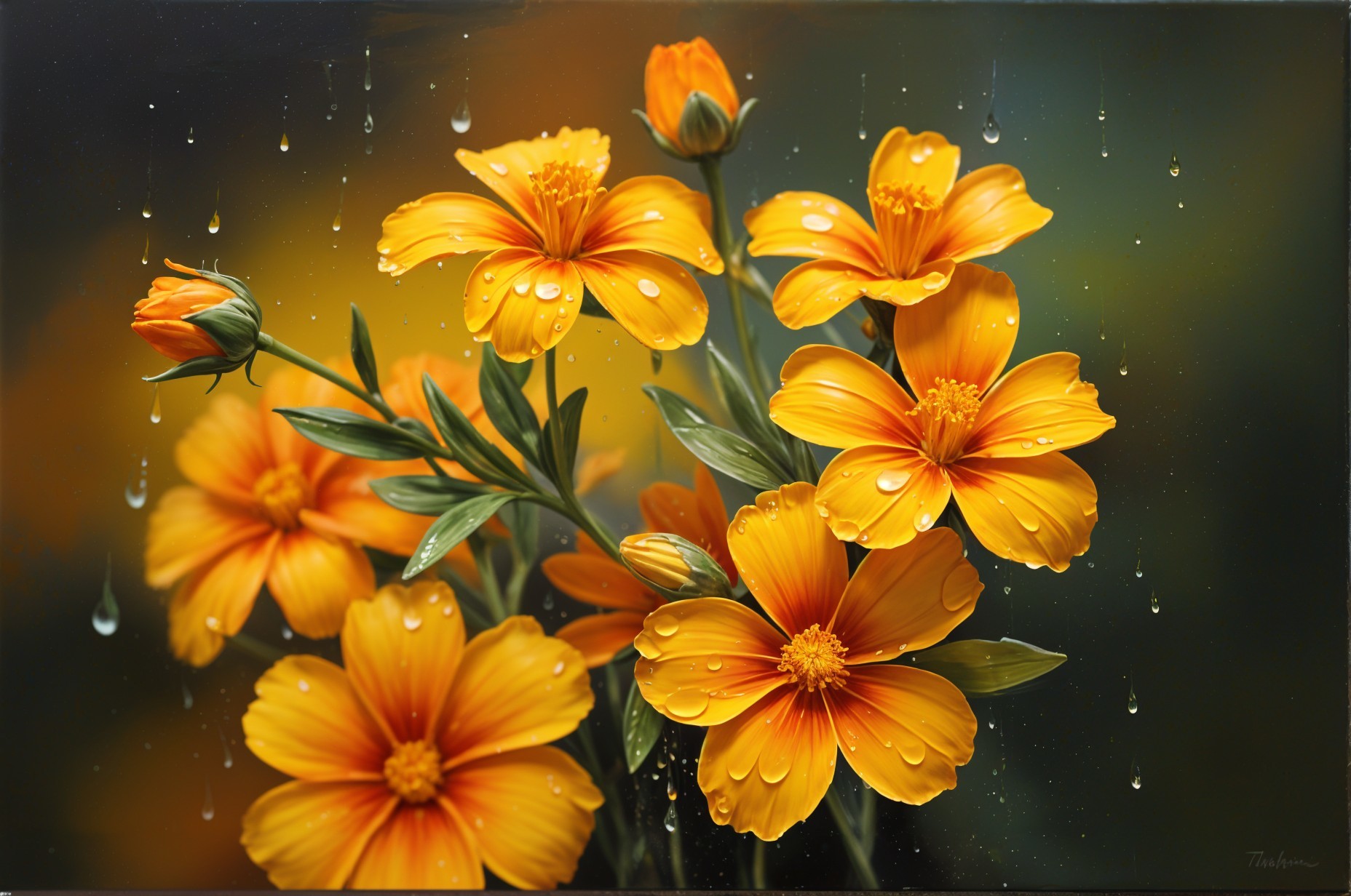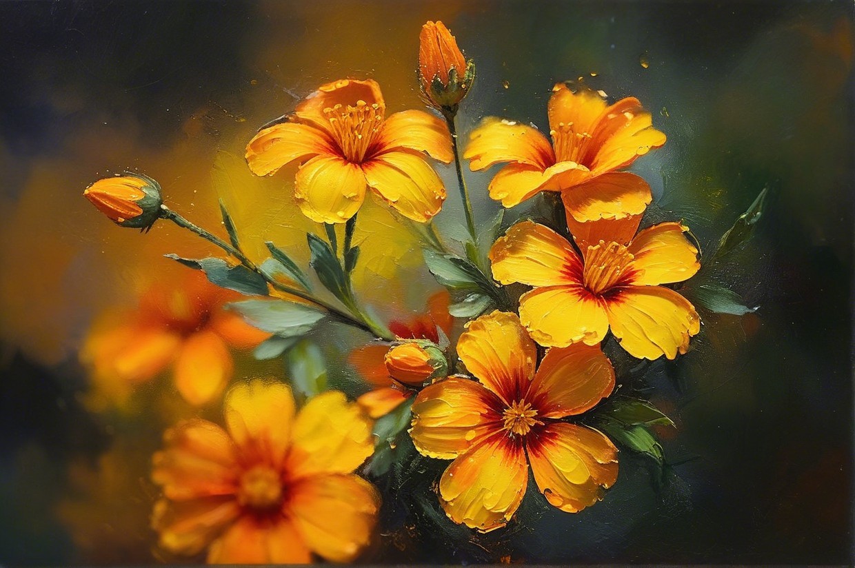 A vibrant painting featuring lush orange flowers against a soft, dark background. The blooms are detailed with droplets, showcasing their rich colors and intricate petals, evoking warmth and beauty.