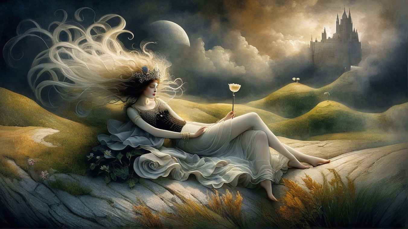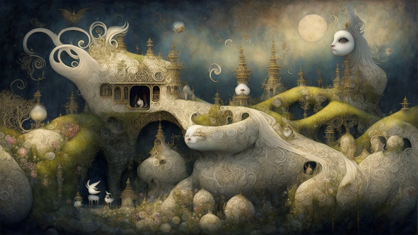 The image features a mysterious woman with striking eyes and elegant makeup, alongside a large, ethereal white cat. In the background, fantastical castles float in a night sky.