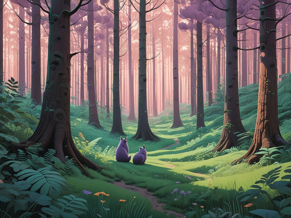 Prompt: A serene and enchanting forest scene during the early morning, featuring tall, slender trees with purple-hued trunks and vibrant green foliage. The soft light filters through the trees, casting gentle shadows on the lush, grassy floor. Two stylized, cartoon-like cats sit together on a winding path, surrounded by colorful flowers and ferns, evoking a sense of tranquility and companionship in nature. Rendered in stunning 8k resolution, with crisp, sharp lines and ArtStation-quality refinement, this illustration invites viewers to step into a fantastical world of dreamlike beauty and magic.