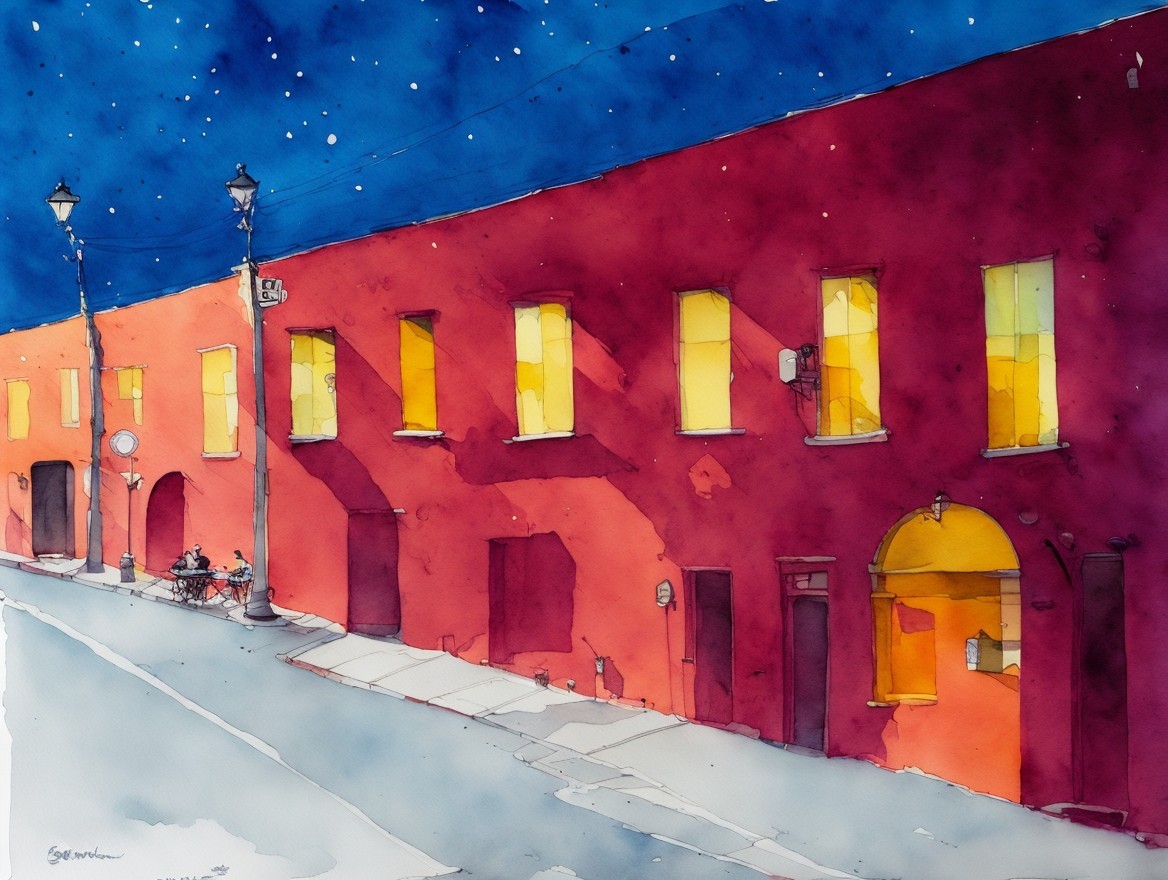 Colorful watercolor painting of a charming street scene with starry sky, buildings, street lamps,