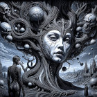 A surreal scene unfolds with a woman in an intricate gown standing before an elaborate, skull-adorned tree. Ethereal spheres and a gothic castle enhance the mystical, dark atmosphere.