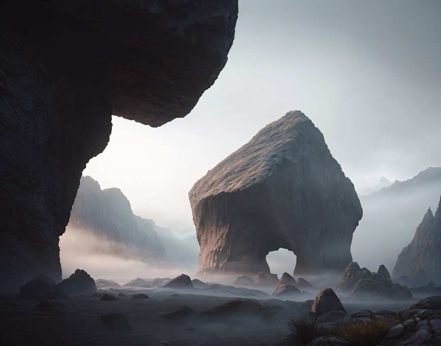 A mystical landscape featuring towering rock formations shrouded in fog. One prominent rock has a natural arch, surrounded by mist and smaller stones, creating an eerie and atmospheric scene.