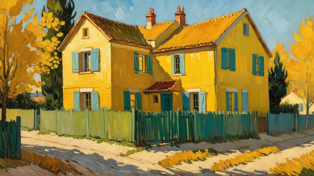 A vibrant oil painting in the style of Vincent van Gogh depicts a large, two-story yellow house with a gabled, orange-tiled roof and multiple chimneys, against a bright blue sky. The house features numerous windows with striking teal blue shutters, some open, some closed. A small,