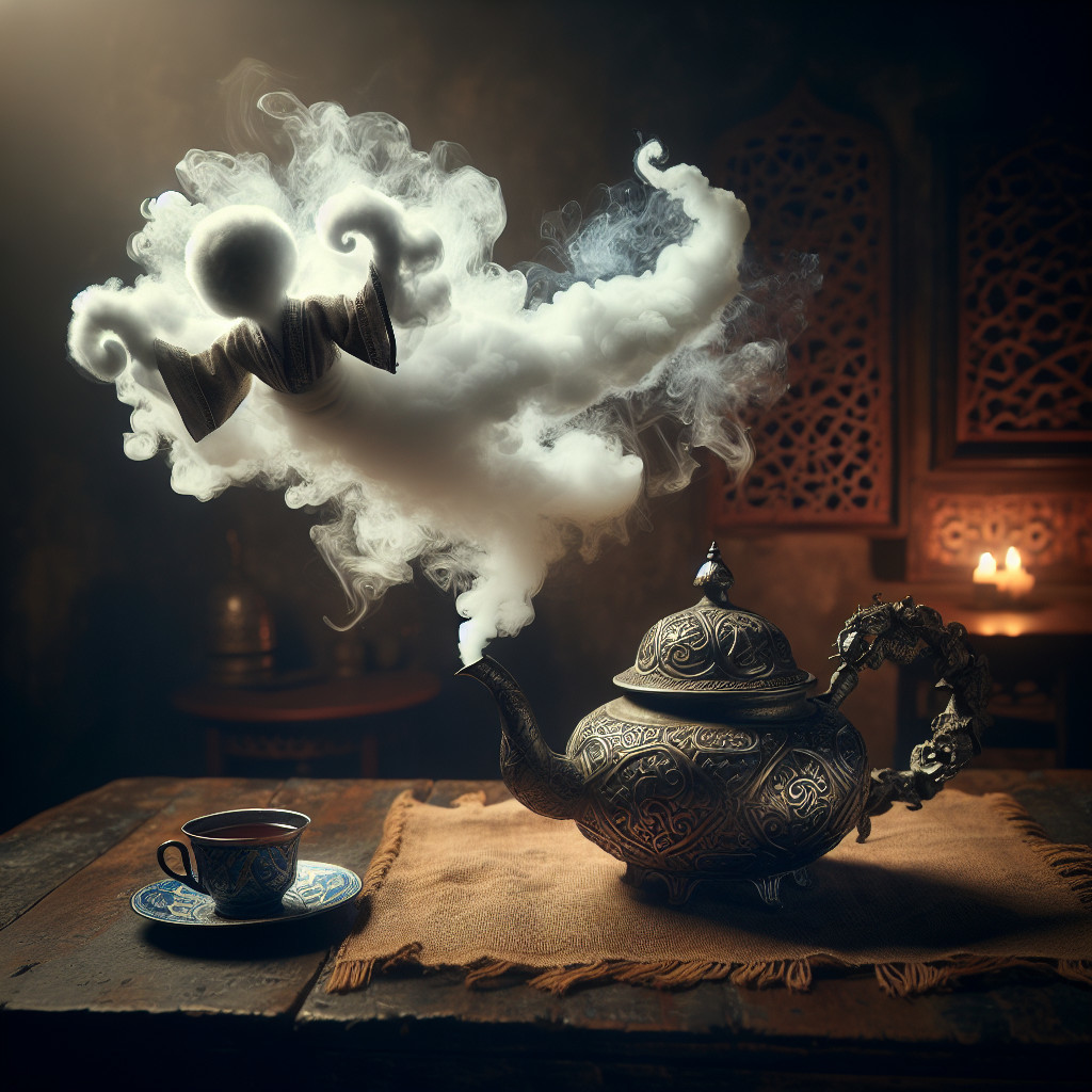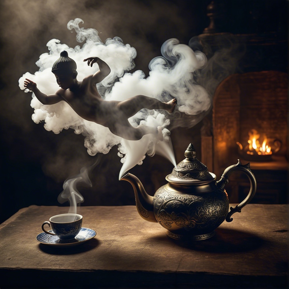 A golden teapot emits swirling smoke, out of which appears a djinn. In the background, a warm glow from a fireplace creates a cozy, enchanting atmosphere.