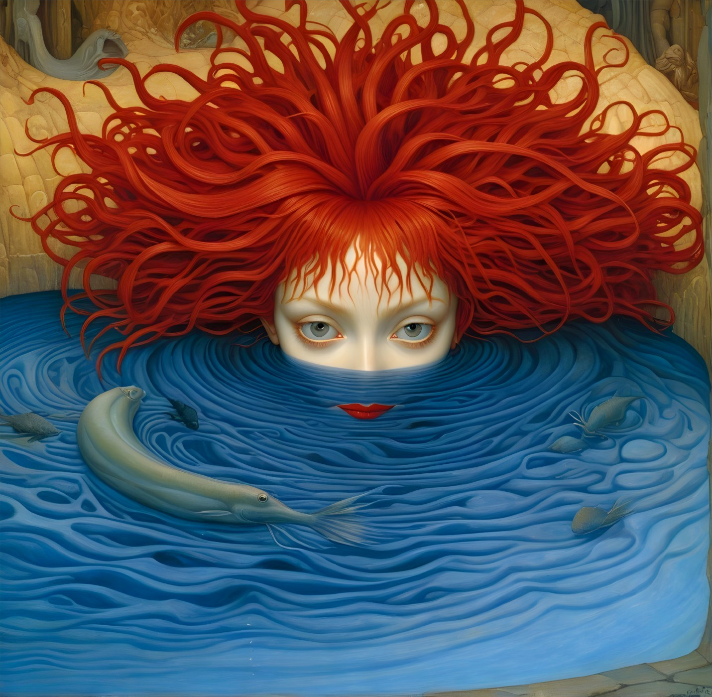 A painting with a character submerged in a body of deep blue water that has ripples, and the character's face is emerging from the surface. The character has bright red hair that spreads out around their head like a flame, and their pale face has striking light blue eyes with dark pupils, and red